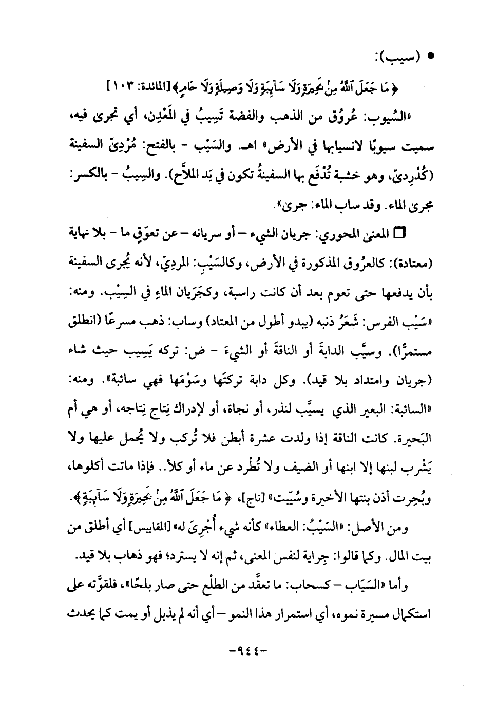 Qجريان الشيء - أو سريانه - عن تعوّقٍ ما - بلا نهاية (معتادة): كالعرُوق المذكورة في الأرض، وكالسَيْبِ: المردِيّ، لأنه يُجرى السفينة بأن يدفعها حتى تعوم بعد أن كانت راسبة، وكجَرَيان الماءِ في السِيْب. ومنه: "سَيْب الفرس: شَعَرُ ذنبه (يبدو أطول من المعتاد) وساب: ذهب مسرعًا (انطلق مستمرًّا). وسيَّب الدابةَ أو الناقةَ أو الشيءَ - ض: تركه يَسِيب حيث شاء (جريان وامتداد بلا قيد). وكل دابة تركتَها وسَوْمَها فهي سائبة ". ومنه: "السائبة: البعير الذي يسيَّب لنذر، أو نجاة، أو لإدراك نِتاج نِتاجه، أو هي أم البَحيرة. كانت الناقة إذا ولدت عشرة أبطن فلا تُركب ولا يُحمل عليها ولا يَشْرب لبنها إلا ابنها أو الضيف ولا تُطْرد عن ماء أو كلأ .. فإذا ماتت أكلوها، وبُحِرت أذن بنتها الأخيرة وسُيّبت " [تاج]، {مَا جَعَلَ اللَّهُ مِنْ بَحِيرَةٍ وَلَا سَائِبَةٍ}.