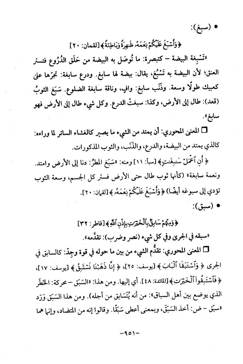 {أَنِ اعْمَلْ سَابِغَاتٍ} [سبأ: 11] ومنه: "سَبَغ المطرُ: دنا إلى الأرض وامتد. ونعمة سابغة " (كأنها ثوب طال حتى الأرض فستر كل الجسم، وسعة الثوب تؤدي إلى سبوغه أيضًا) {وَأَسْبَغَ عَلَيْكُمْ نِعَمَهُ} [لقمان: 20].