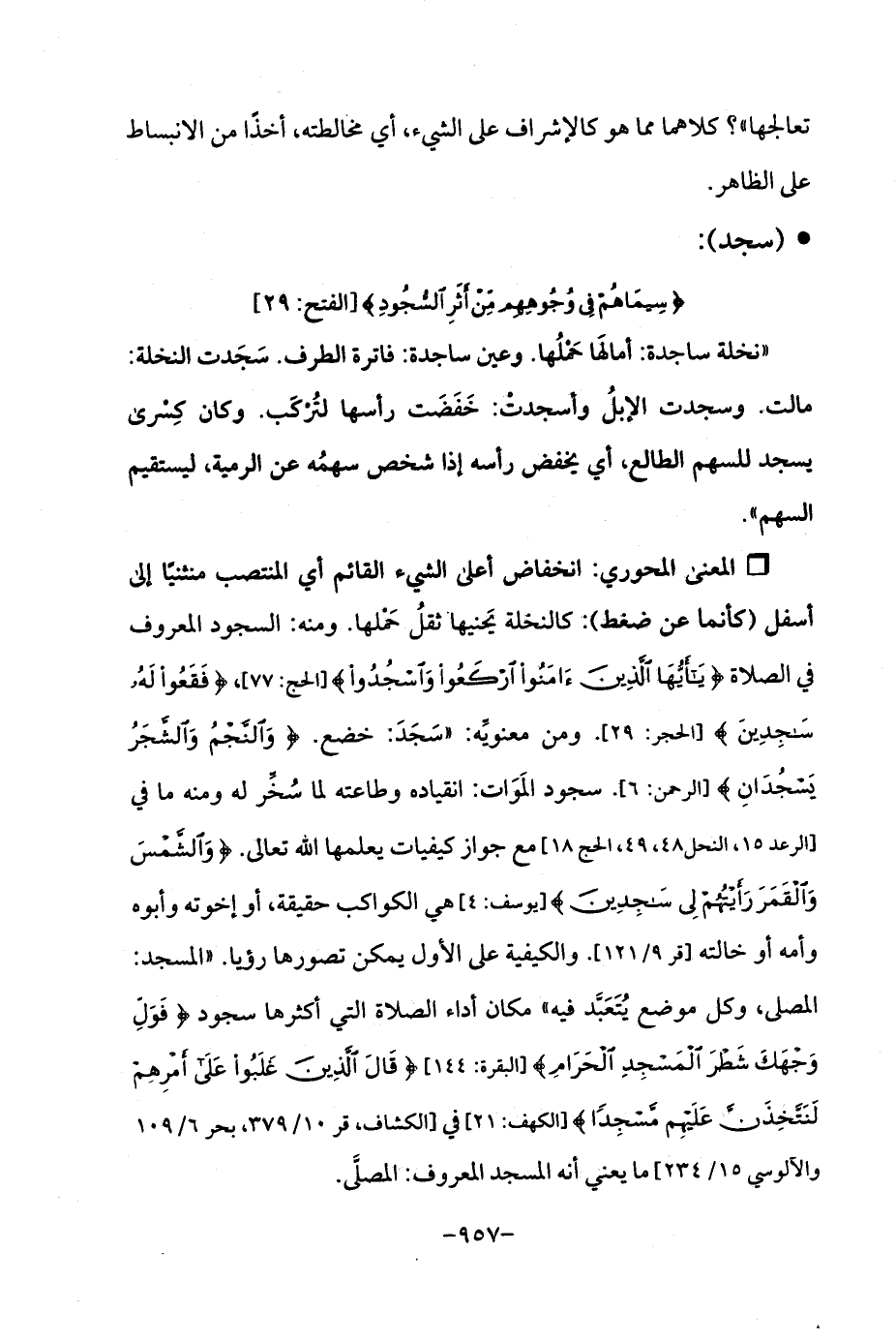 Qانخفاض أعلى الشيء القائم أي المنتصب منثنيًا إلى أسفل (كأنما عن ضغط): كالنخلة يَحنيها ثقلُ حَمْلها. ومنه: السجود المعروف في الصلاة {يَاأَيُّهَا الَّذِينَ آمَنُوا ارْكَعُوا وَاسْجُدُوا} [الحج: 77]، {فَقَعُوا لَهُ سَاجِدِينَ} [الحجر: 29]. ومن معنويَّه: "سَجَدَ: خضع. {وَالنَّجْمُ وَالشَّجَرُ يَسْجُدَانِ} [الرحمن: 6]. سجود المَوَات: انقياده وطاعته لما سُخَّر له ومنه ما في [الرعد 15، النحل 48، 49، الحج 18] مع جواز كيفيات يعلمها الله تعالى. {وَالشَّمْسَ وَالْقَمَرَ رَأَيْتُهُمْ لِي سَاجِدِينَ} [يوسف: 4] هي الكواكب حقيقة، أو إخوته وأبوه وأمه أو خالته [قر 9/ 121]. والكيفية على الأول يمكن تصورها رؤيا. "المسجد: المصلى، وكل موضع يُتَعَبَّد فيه "مكان أداء الصلاة التي أكثرها سجود {فَوَلِّ وَجْهَكَ شَطْرَ الْمَسْجِدِ الْحَرَامِ} [البقرة: 144] {قَالَ الَّذِينَ غَلَبُوا عَلَى أَمْرِهِمْ لَنَتَّخِذَنَّ عَلَيْهِمْ مَسْجِدًا} [الكهف: 21] في [الكشاف، قر 10/ 379، بحر 6/ 109 والآلوسي 15/ 234] ما يعني أنه المسجد المعروف: المصلَّى.