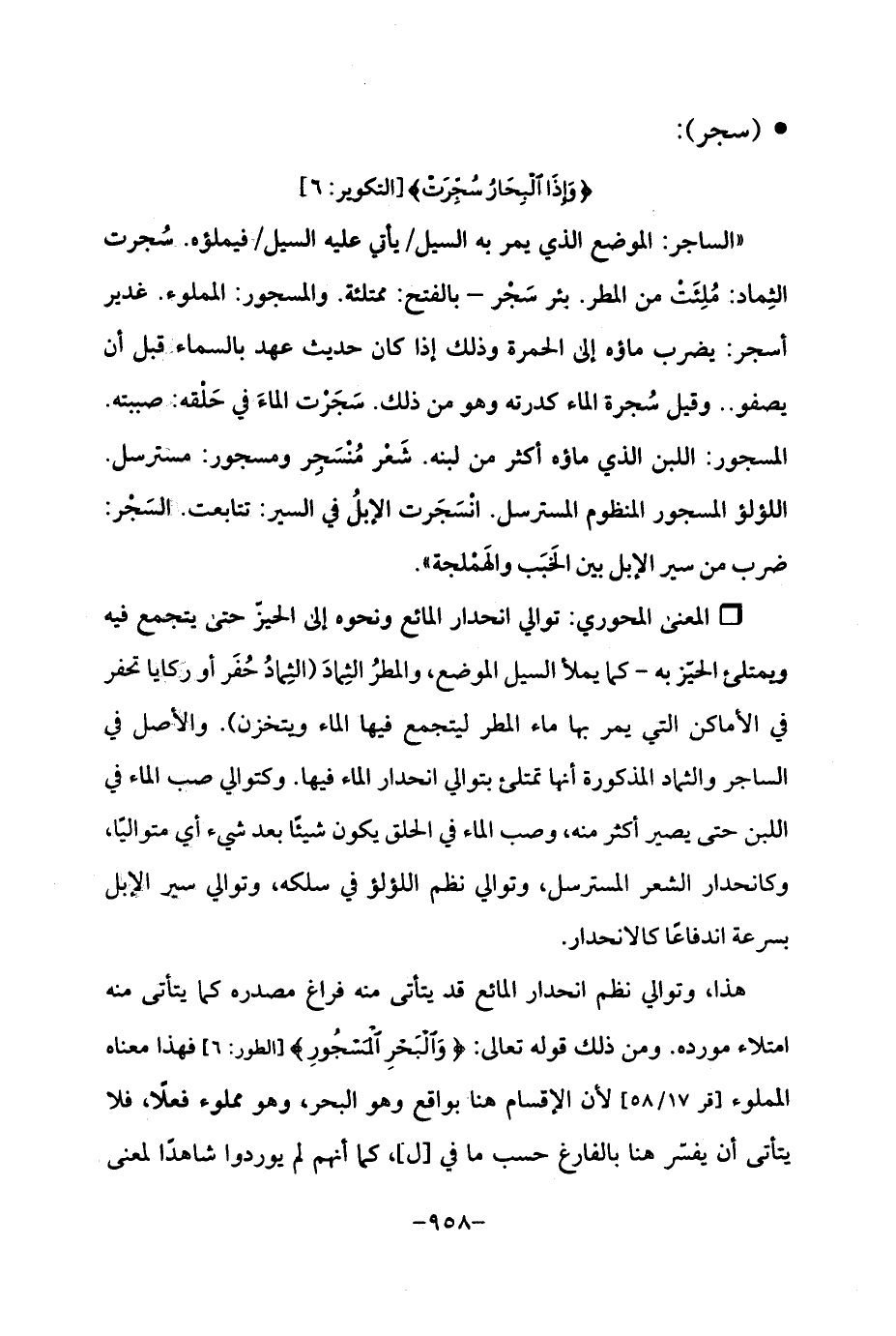 هذا، وتوالي نظم انحدار المائع قد يتأتى منه فراغ مصدره كما يتأتى منه امتلاء مورده. ومن ذلك قوله تعالى: {وَالْبَحْرِ الْمَسْجُورِ} [الطور: 6] فهذا معناه المملوء [قر 17/ 58] لأن الإقسام هنا بواقع وهو البحر، وهو مملوء فعلًا، فلا يتأتى أن يفسّر هنا بالفارغ حسب ما في [ل]، كما أنهم لم يوردوا شاهدًا لمعنى