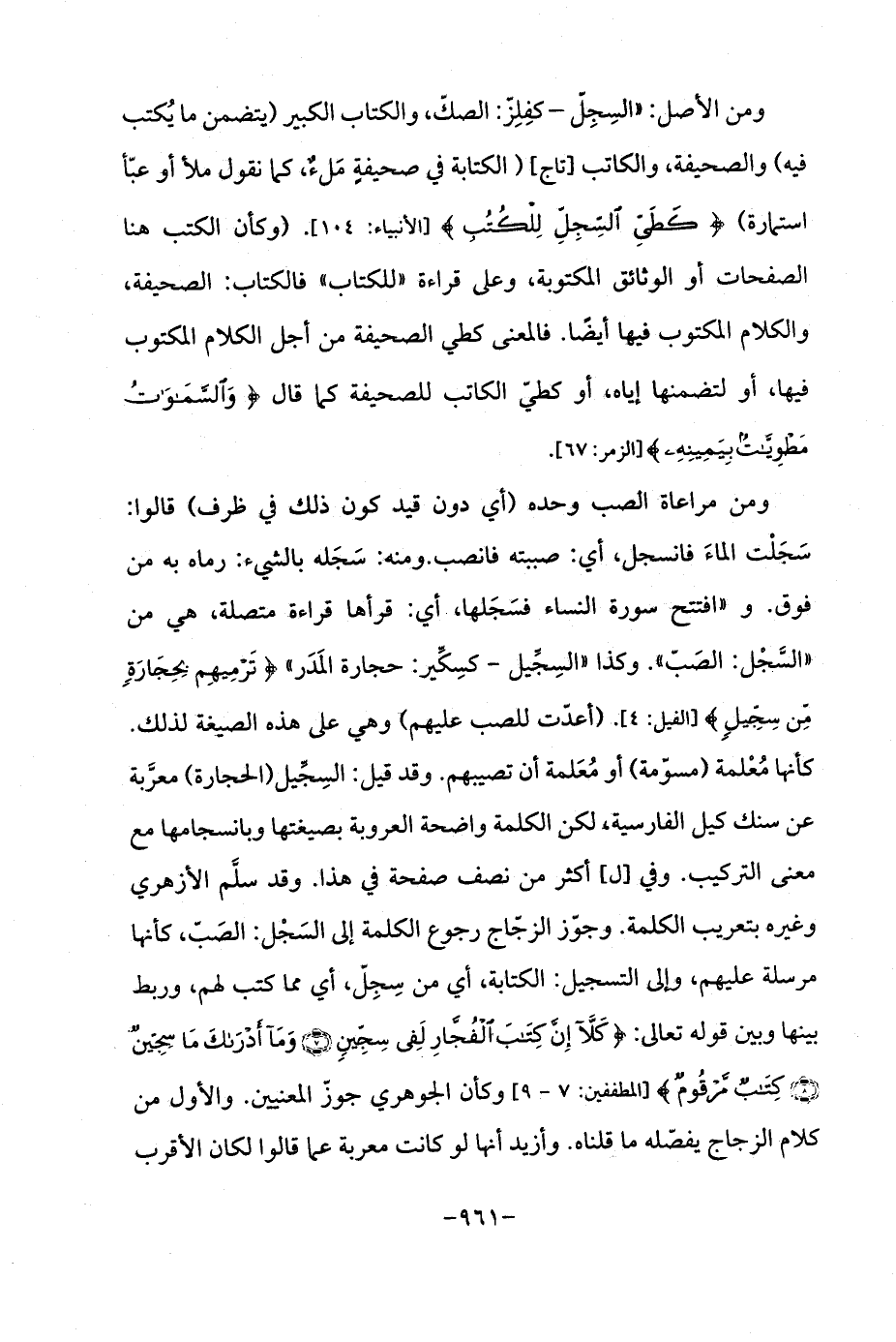 ومن مراعاة الصب وحده (أي دون قيد كون ذلك في ظرف) قالوا: سَجَلْت الماءَ فانسجل، أي: صببته فانصب. ومنه: سَجَله بالشيء: رماه به من فوق. و "افتتح سورة النساء فسَجَلها، أي: قرأها قراءة متصلة، هي من "السَّجْل: الصَبّ ". وكذا "السِجِّيل - كسِكَّير: حجارة المَدَر " {تَرْمِيهِمْ بِحِجَارَةٍ مِنْ سِجِّيلٍ} [الفيل: 4]. (أعدَّت للصب عليهم) وهي على هذه الصيغة لذلك. كأنها مُعْلمة (مسوّمة) أو مُعَلمة أن تصيبهم. وقد قيل: السِجِّيل (الحجارة) معرَّبة عن سنك كيل الفارسية، لكن الكلمة واضحة العروبة بصيغتها وبانسجامها مع معنى التركيب. وفي [ل] أكثر من نصف صفحة في هذا. وقد سلَّم الأزهري وغيره بتعريب الكلمة. وجوّز الزجَّاج رجوع الكلمة إلى السَجْل: الصَبّ، كأنها مرسلة عليهم، وإلى التسجيل: الكتابة، أي من سِجِلّ، أي مما كتب لهم، وربط بينها وبين قوله تعالى: {كَلَّا إِنَّ كِتَابَ الْفُجَّارِ لَفِي سِجِّينٍ (7) وَمَا أَدْرَاكَ مَا سِجِّينٌ (8) كِتَابٌ مَرْقُومٌ} [المطففين: 7 - 9] وكأن الجوهري جوز المعنيين. والأول من كلام الزجاج يفصّله ما قلناه. وأزيد أنها لو كانت معربة عما قالوا لكان الأقرب