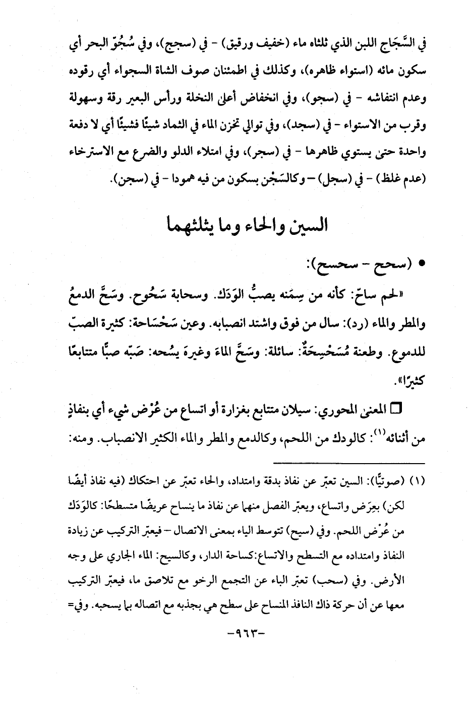 (¬1) (صوتيًّا): السين تعبّر عن نفاذ بدقة وامتداد، والحاء تعبّر عن احتكاك (فيه نفاذ أيضًا لكن) بعِرَض واتساع، ويعبّر الفصل منهما عن نفاذ ما ينساح عريضًا متسطحًا: كالوَدَك من عُرْض اللحم. وفي (سيح) تتوسط الياء بمعنى الاتصال - فيعبّر التركيب عن زيادة النفاذ وامتداده مع التسطح والاتساع: كساحة الدار، وكالسيح: الماء الجاري على وجه الأرض. وفي (سحب) تعبّر الباء عن التجمع الرخو مع تلاصق ما، فيعبّر التركيب معها عن أن حركة ذاك النافذ المنساح على سطح هي بجذبه مع اتصاله بما يسحبه. وفي =