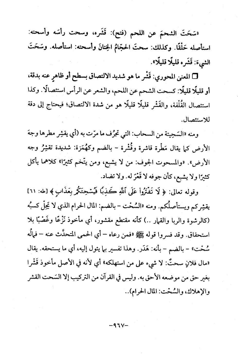 وقوله تعالى: {لَا تَفْتَرُوا عَلَى اللَّهِ كَذِبًا فَيُسْحِتَكُمْ بِعَذَابٍ} [طه: 61] يقشِركم ويستأصلُكم. ومنه "السُحْت - بالضم: المال الحرام الذي لا يَحِلّ كسبُه (كالرشوة والربا والقمار ..) كأنه مقتطع مقشور، أي مأخوذ نَزْعًا وغَصْبًا بلا استحقاق. وقد فسروا قوله - صلى الله عليه وسلم - "فمن رعاه - أي الحمى المتحدَّث عنه - فمالُه سُحْت "- بالضم - بأنه: هَدَر. وهذا تفسير بما يئول إليه، أي ما يستحقه. يقال "مال فلانٍ سحتٌ: لا شيء على من استهلكه "أي لأنه في الأصل مأخوذ قَشْرا بغير حق من موضعه الأحق به. وليس في القرآن من التركيب إلا السَحت القشر والإهلاك، والسُحْت: المال الحرام) ..