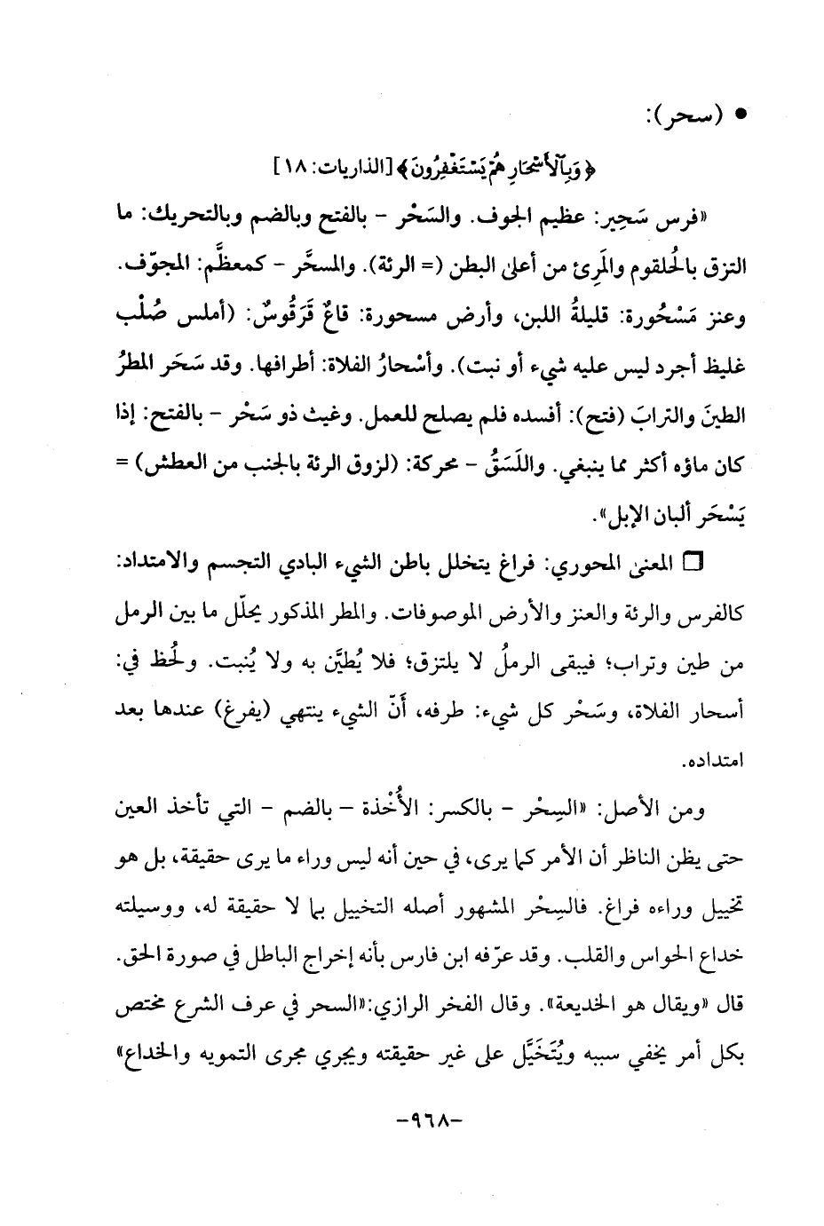 Qفراغ يتخلل باطن الشيء البادي التجسم والامتداد: كالفرس والرئة والعنز والأرض الموصوفات. والمطر المذكور يحلّل ما بين الرمل من طين وتراب؛ فيبقى الرملُ لا يلتزق؛ فلا يُطيَّن به ولا يُنبت. ولُحظ في: أسحار الفلاة، وسَحْر كل شيء: طرفه، أَنّ الشيء ينتهي (يفرغ) عندها بعد امتداده.