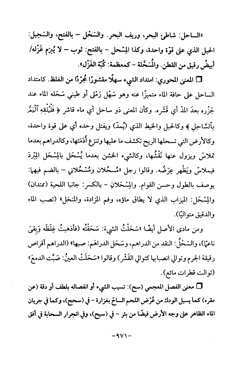 "الساحل: شاطئ البحر، وريف البحر. والسَحْل - بالفتح، والسَحِيل: الحبل الذي على قوّة واحدة، وكذا المِسْحل - بالفتح: ثوب - لا يُبرَم غَزْله/ أبيضُ رقيق من القطن. والمُسَحَّلة - كمعظمة: كُبّة الغَزْل ".