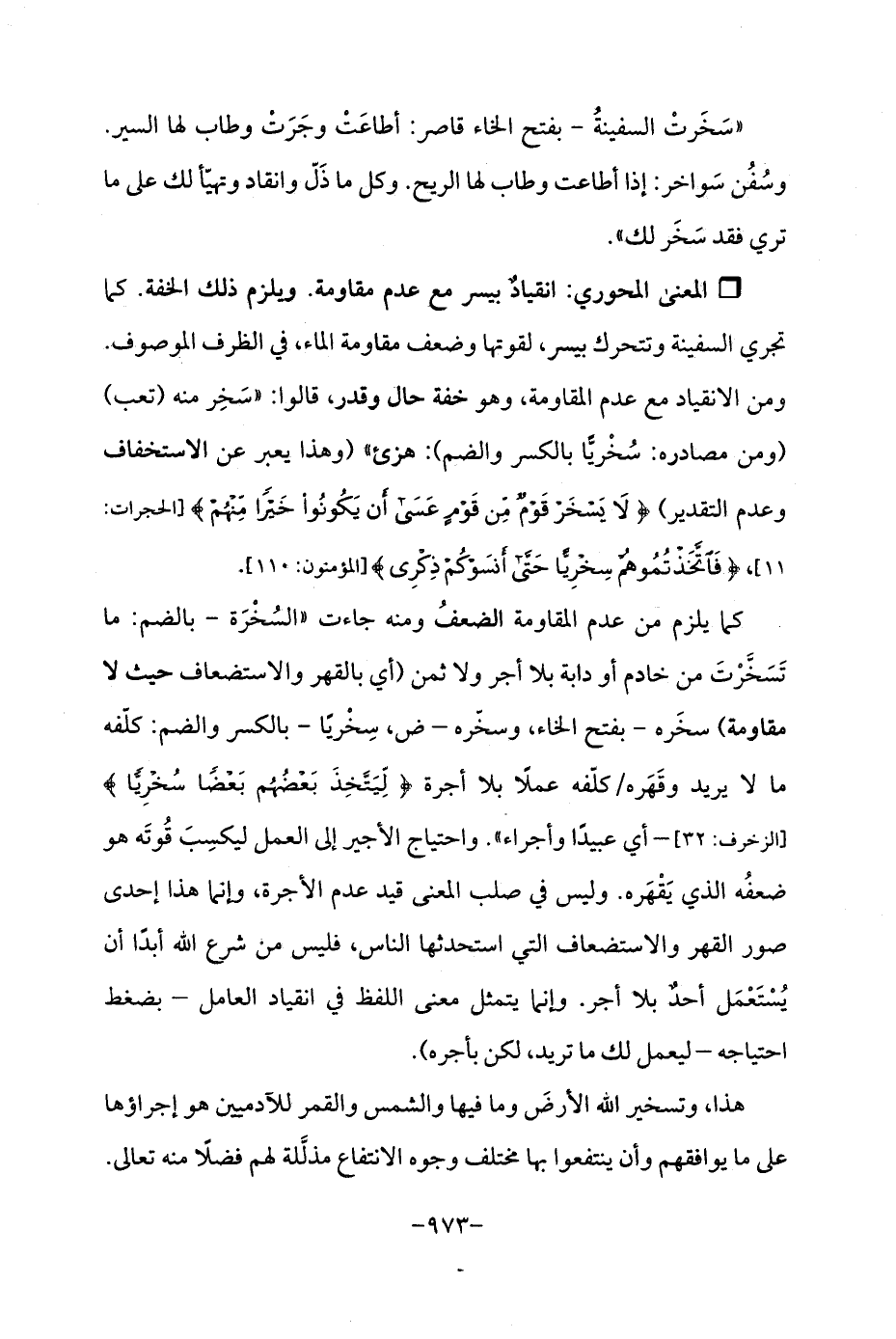 Qانقيادٌ بيسر مع عدم مقاومة. ويلزم ذلك الخفة. كما تجري السفينة وتتحرك بيسر، لقوتها وضعف مقاومة الماء، في الظرف الموصوف. ومن الانقياد مع عدم المقاومة، وهو خفة حال وقدر، قالوا: "سَخِر منه (تعب) (ومن مصادره: سُخْريًّا بالكسر والضم): هزئ " (وهذا يعبر عن الاستخفاف وعدم التقدير) {لَا يَسْخَرْ قَوْمٌ مِنْ قَوْمٍ عَسَى أَنْ يَكُونُوا خَيْرًا مِنْهُمْ} [الحجرات: 11]، {فَاتَّخَذْتُمُوهُمْ سِخْرِيًّا حَتَّى أَنْسَوْكُمْ ذِكْرِي} [المؤمنون: 110].