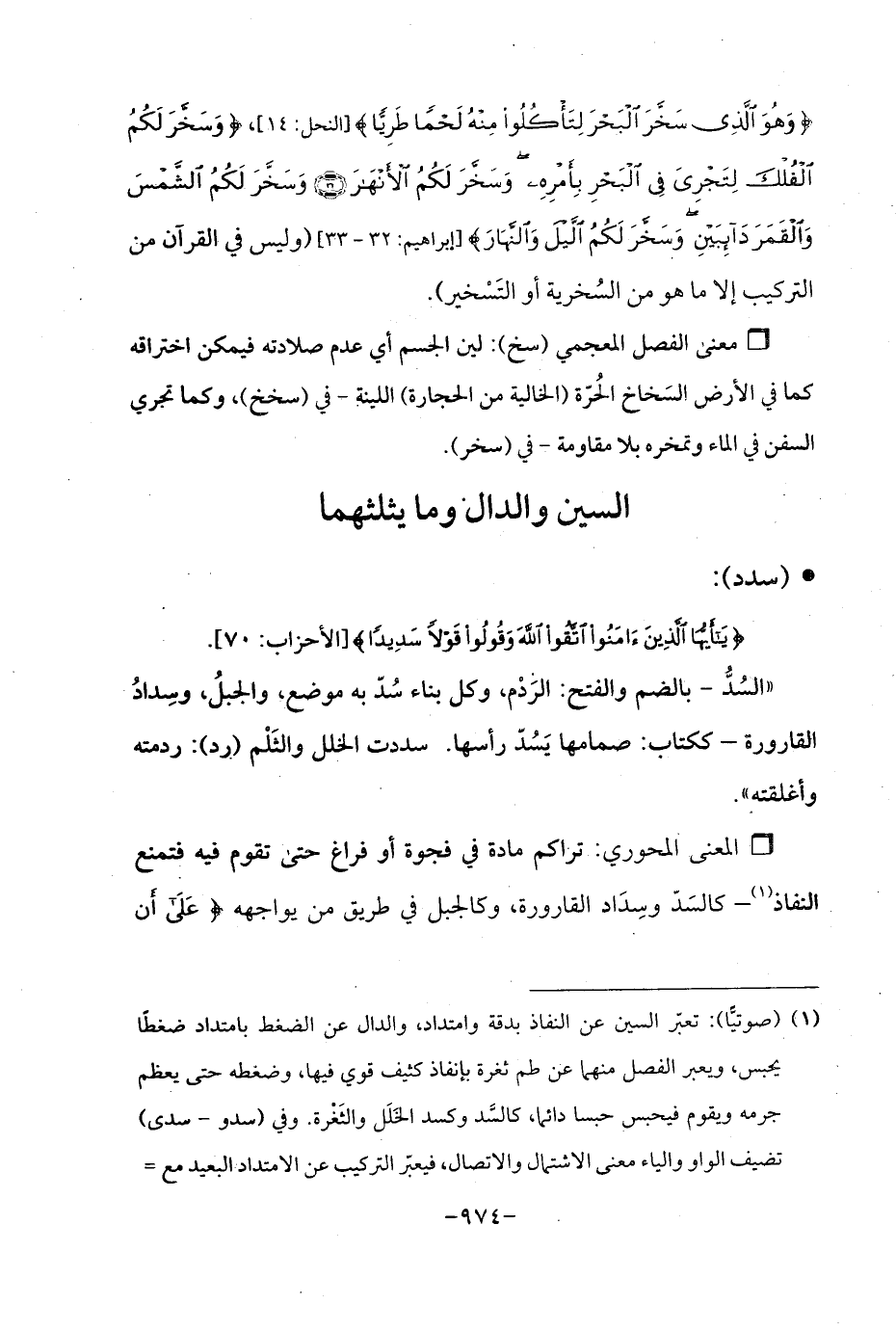 (¬1) (صوتيًّا): تعبّر السين عن النفاذ بدقة وامتداد، والدال عن الضغط بامتداد ضغطًا يحبس، ويعبر الفصل منهما عن طم ثغرة بإنفاذ كثيف قوي فيها، وضغطه حتى يعظم جرمه ويقوم فيحبس حبسا دائما، كالسَّد وكسد الخَلَل والثَغْرة. وفي (سدو - سدى) تضيف الواو والياء معنى الاشتمال والاتصال، فيعبّر التركيب عن الامتداد البعيد مع =