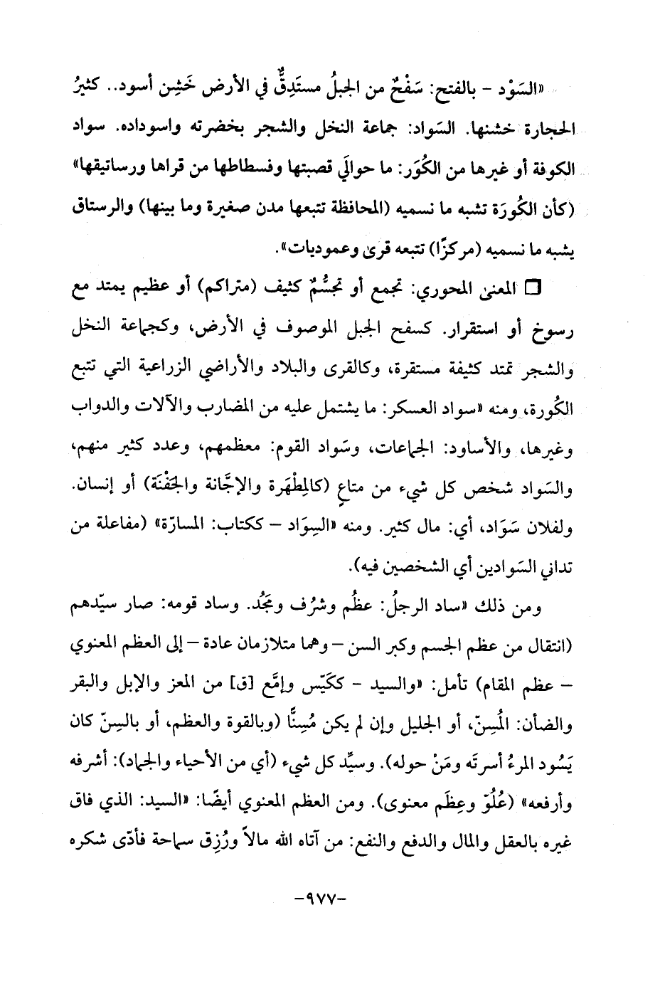 "السَوْد - بالفتح: سَفْحٌ من الجبلُ مستَدِقٌّ في الأرض خَشِن أسود .. كثيرُ الحجارة خشنها. السَواد: جماعة النخل والشجر بخضرته واسوداده. سواد الكوفة أو غيرها من الكُوَر: ما حوالَي قصبتها وفسطاطها من قراها ورساتيقها " (كأن الكُورَة تشبه ما نسميه (المحافظة تتبعها مدن صغيرة وما بينها) والرستاق يشبه ما نسميه (مركزًا) تتبعه قرى وعموديات ".