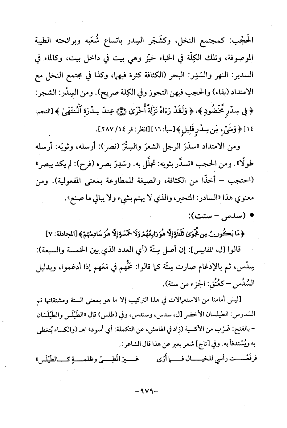 [ليس أمامنا من الإستعمالات في هذا التركيب إلا ما هو بمعنى الستة ومشتقاتها ثم السَدوس: الطيلسان الأخضر [ل، سدس، وسندس، وفي (طلس) قال "الطَيْلَس والطَيْلَسَان - بالفتح: ضَرْب من الأكسية (زاد في الهامش، عن التكملة: أي أسود "اهـ (والكساء يُتغطى به ويُسْتدفأ به. وفي [تاج] شعر يعبر عن هذا قال الشاعر: