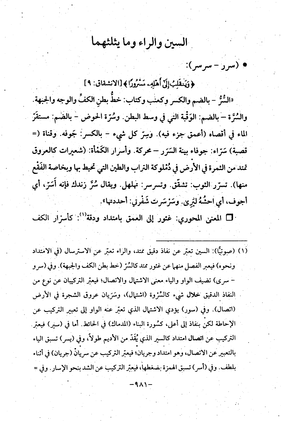 (¬1) (صوتيًّا): السين تعبّر عن نفاذ دقيق ممتد، والراء تعبّر عن الاسترسال (فى الامتداد ونحوه) فيعبر الفصل منهما عن غئور ممتد كالسُرّ (خط بطن الكف والجبهة). وفي (سرو - سرى) تضيف الواو والياء معنى الاشتمال والاتصال؛ فيعبر التركيبان عن نوع من النفاذ الدقيق خلال شيء كالسِّرْوة (اشتمال)، وسَرَيان عروق الشجرة في الأرض (اتصال). وفي (سور) يؤدي الاشتمال الذي تعبر عنه الواو إلى تعبير التركيب عن الإحاطة لكن بنفاذ إلى أعلى، كسُورة البناء (المدماك) في الحائط. أما في (سير) فيعبّر التركيب عن اتصال امتداد كالسير الذي يُقَدّ من الأديم طولًا، وفي (يسر) تسبق الياء بالتعبير عن الاتصال، وهو امتداد وجريان؛ فيعبّر التركيب عن سريان (جريان) في أثناء بلطف. وفي (أسر) تسبق الهمزة بضغطها، فيعبّر التركيب عن الشد بنحو الإسار. وفي =