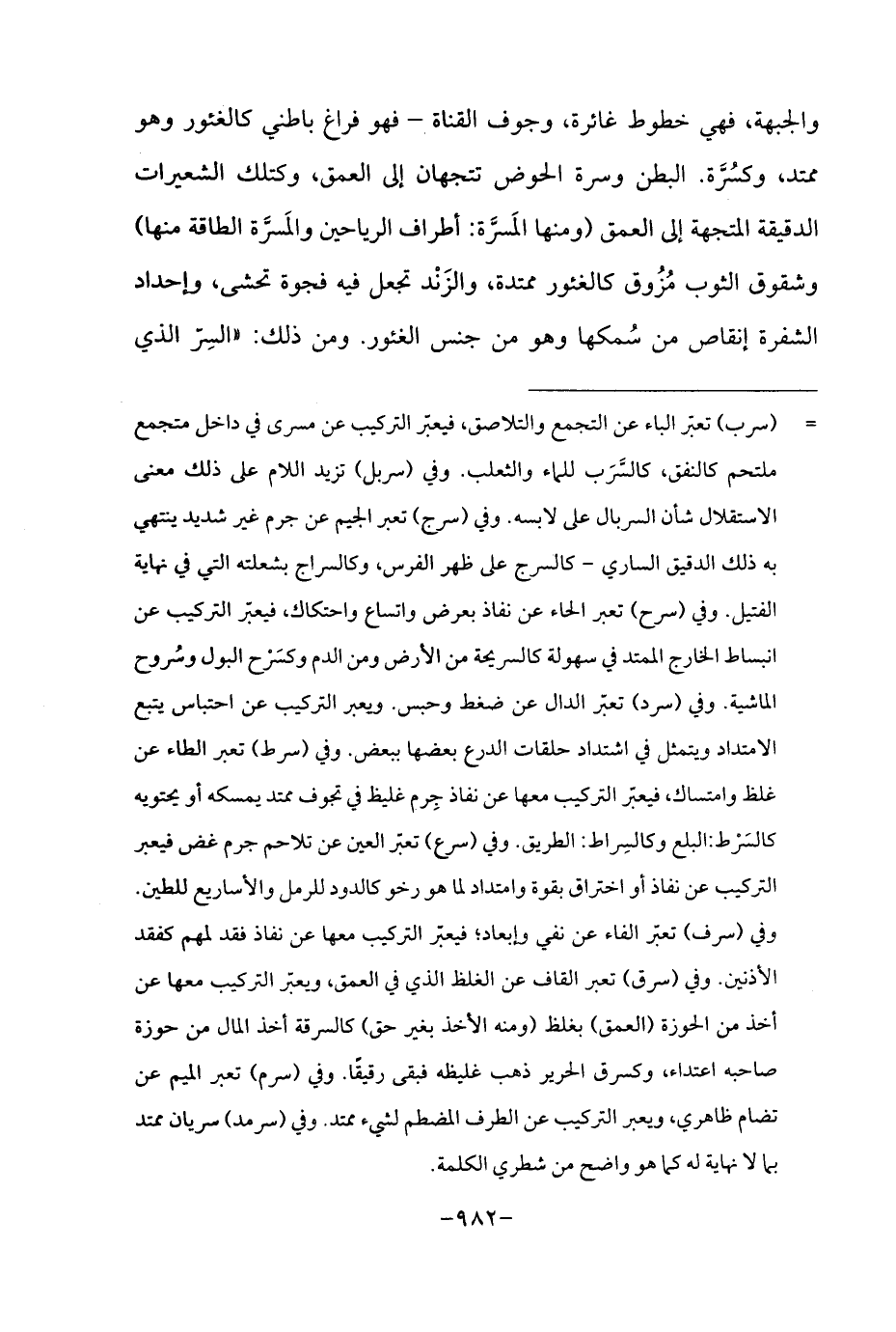 = (سرب) تعبّر الباء عن التجمع والتلاصق، فيعبّر التركيب عن مسرى في داخل متجمع ملتحم كالنفق، كالسَّرَب للماء والثعلب. وفي (سربل) تزيد اللام على ذلك معنى الاستقلال شأن السربال على لابسه. وفي (سرج) تعبر الجيم عن جرم غير شديد ينتهي به ذلك الدقيق الساري - كالسرج على ظهر الفرس، وكالسراج بشعلته التي في نهاية الفتيل. وفي (سرح) تعبر الحاء عن نفاذ بعرض واتساع واحتكاك، فيعبر التركيب عن انبساط الخارج الممتد في سهولة كالسريحة من الأرض ومن الدم وكسَرْح البول وسُروح الماشية. وفي (سرد) تعبّر الدال عن ضغط وحبس. ويعبر التركيب عن احتباس يتبع الامتداد ويتمثل في اشتداد حلقات الدرع بعضها ببعض. وفي (سرط) تعبر الطاء عن غلظ وامتساك، فيعبر التركيب معها عن نفاذ جِرم غليظ في تجوف ممتد يمسكه أو يحتويه كالسَرْط: البلع وكالسِراط: الطريق. وفي (سرع) تعبّر العين عن تلاحم جرم غض فيعبر التركيب عن نفاذ أو اختراق بقوة وامتداد لما هو رخو كالدود للرمل والأساريع للطين. وفي (سرف) تعبّر الفاء عن نفي وإبعاد؛ فيعبّر التركيب معها عن نفاذ فقد لمهم كفقد الأذنين. وفي (سرق) تعبر القاف عن الغلظ الذي في العمق، ويعبّر التركيب معها عن أخذ من الحوزة (العمق) بغلظ (ومنه الأخذ بغير حق) كالسرقة أخذ المال من حوزة صاحبه اعتداء، وكسرق الحرير ذهب غليظه فبقى رقيقًا. وفي (سرم) تعبر الميم عن تضام ظاهري، ويعبر التركيب عن الطرف المضطم لشيء ممتد. وفي (سرمد) سريان ممتد بما لا نهاية له كما هو واضح من شطري الكلمة.