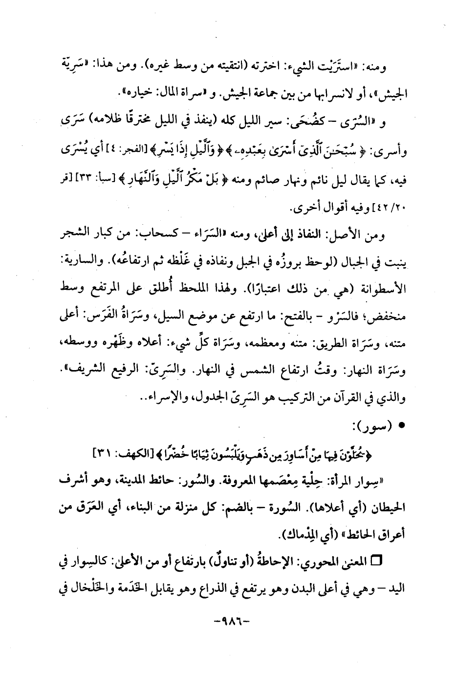 و"السُرَى - كضُحَى: سير الليل كله (ينفذ في الليل مخترقًا ظلامه) سَرَى وأسرى: {سُبْحَانَ الَّذِي أَسْرَى بِعَبْدِهِ} {وَاللَّيْلِ إِذَا يَسْرِ} [الفجر: 4] أي يُسْرَى فيه، كما يقال ليل نائم ونهار صائم ومنه {بَلْ مَكْرُ اللَّيْلِ وَالنَّهَارِ} [سبأ: 33] [قر 20/ 42] وفيه أقوال أخرى.