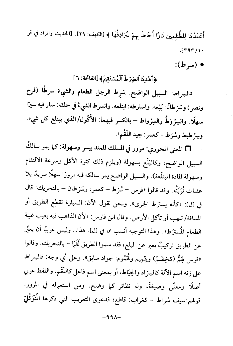 Qمرور في المسلك الممتد بيسر وسهولة: كما يمر سالكُ السبيل الواضح، وكالبَلْع بسهولة (ويلزم ذلك كثرة الأكل وسرعة الالتقام وسهولة المادة المبتلَعة). والسبيل الواضح يمر سالكه فيه مرورًا سهلًا سريعًا بلا عقبات تُرَيّثُه. وقد قالوا "فرس - سُرَط - كعمر، وسَرَطان - بالتحريك: قال في [ل]: "كأنه يسترط الجرى ". ونحن نقول الآن: السيارة تقطع الطريق أو المسافة/ تنهب أو تأكل الأرض. وقال ابن فارس: "لأن الذاهب فيه يغيب غيبة الطعام المُسترَط ". وهذا التوجيه أنسب مما في [ل]. هذا .. وليس غريبًا أن يعبِّر عن الطريق تركيبٌ يعبر عن البلع، فقد سموا الطريق لَقَمًا - بالتحريك. وقالوا "فرس لِهَمٌّ (كخِضَمّ) ولِهْمِيم ولُهْمُوم: جواد سابق ". وعلى أي وجه: فالسِراط على زنة اسم الآلة كالسِرَاد والخِيَاط، أو بمعنى اسم فاعل كاللَقَم. واللفظ عربي أصلًا ومعنًى وصيغةً، وله نظائر كما وضح. ومن استعماله في المرور: قولهم: سيف سُراط - كغراب: قاطع؛ فدعوى التعريب التي ذكرها المُتَوَكَّليّ