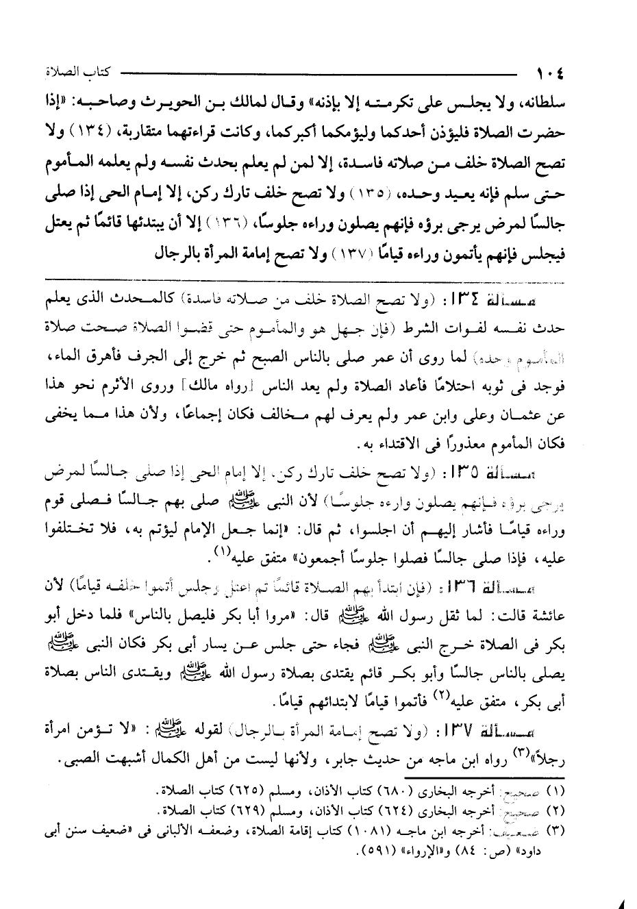 مسألة 137: (ولا تصح إمامة المرأة بالرجال) لقوله - صَلَّى اللَّهُ عَلَيْهِ وَسَلَّمَ -: «لا تؤمن امرأة رجلاً» رواه ابن ماجه من حديث جابر، ولأنها ليست من أهل الكمال أشبهت الصبي.