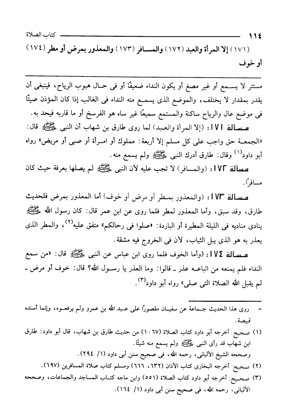 مسألة 171: (إلا المرأة والعبد) لما روى طارق بن شهاب أن النبي - صَلَّى اللَّهُ عَلَيْهِ وَسَلَّمَ - قال: «الجمعة حق واجب على كل مسلم إلا أربعة: مملوك أو امرأة أو صبي أو مريض» رواه أبو داود، وقال: طارق أدرك النبي - صَلَّى اللَّهُ عَلَيْهِ وَسَلَّمَ - ولم يسمع منه.
