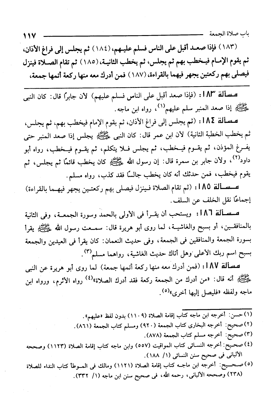 ـــــــــــــــــــــــــــــQمسألة 183: (فإذا صعد أقبل على الناس فسلم عليهم) ، لأن جابراً قال: «كان النبي - صَلَّى اللَّهُ عَلَيْهِ وَسَلَّمَ - إذا صعد المنبر سلم عليهم» ، رواه ابن ماجه.