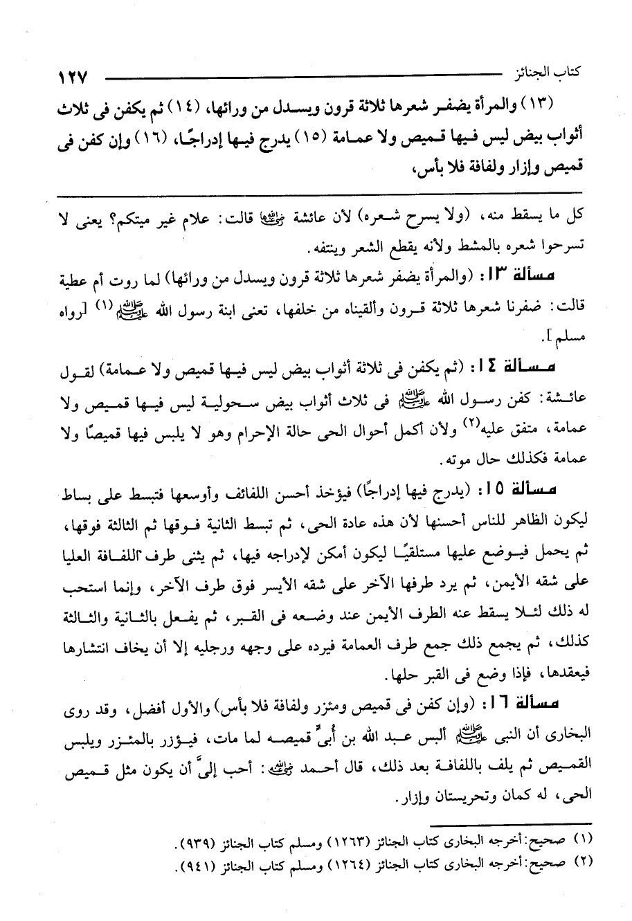 مسألة 13: (والمرأة يضفر شعرها ثلاثة قرون ويسدل من ورائها) لما روت أم عطية قالت: «ضفرنا شعرها ثلاثة قرون وألقيناه من خلفها، تعني ابنة رسول الله - صَلَّى اللَّهُ عَلَيْهِ وَسَلَّمَ -» [رواه مسلم] .