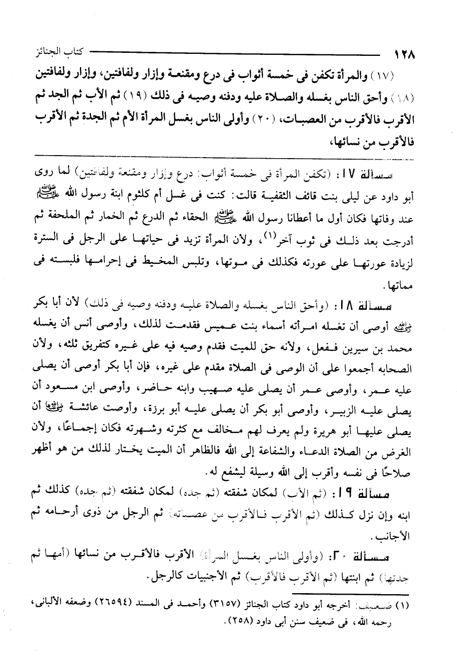 (20) وأولى الناس بغسل المرأة الأم ثم الجدة ثم الأقرب فالأقرب من نسائها