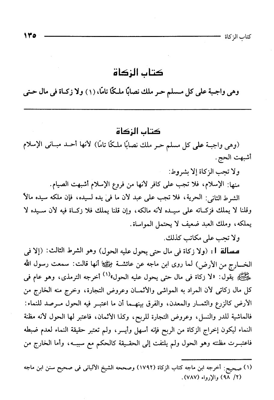 مسألة 1: (ولا زكاة في مال حتى يحول عليه الحول) وهو الشرط الثالث (إلا في الخارج من الأرض) لما روى ابن ماجه عن عائشة - رَضِيَ اللَّهُ عَنْهَا - أنها قالت: سمعت رسول الله - صَلَّى اللَّهُ عَلَيْهِ وَسَلَّمَ - يقول: «لا زكاة في مال حتى يحول عليه الحول» أخرجه الترمذي، وهو عام في كل مال زكاتي لأن المراد به المواشي والأثمان وعروض التجارة، وخرج منه الخارج من الأرض كالزرع والثمار والمعدن، والفرق بينهما أن ما اعتبر فيه الحول مرصد للنماء: فالماشية للدر والنسل، وعروض التجارة للربح، وكذا الأثمان، فاعتبر لها الحول لأنه مظنة النماء ليكون إخراج الزكاة من الربح فإنه أسهل وأيسر، ولم تعتبر حقيقة النماء لعدم ضبطه فاعتبرت مظنته وهو الحول ولم يلتفت إلى الحقيقة كالحكم مع سببه، وأما الخارج من