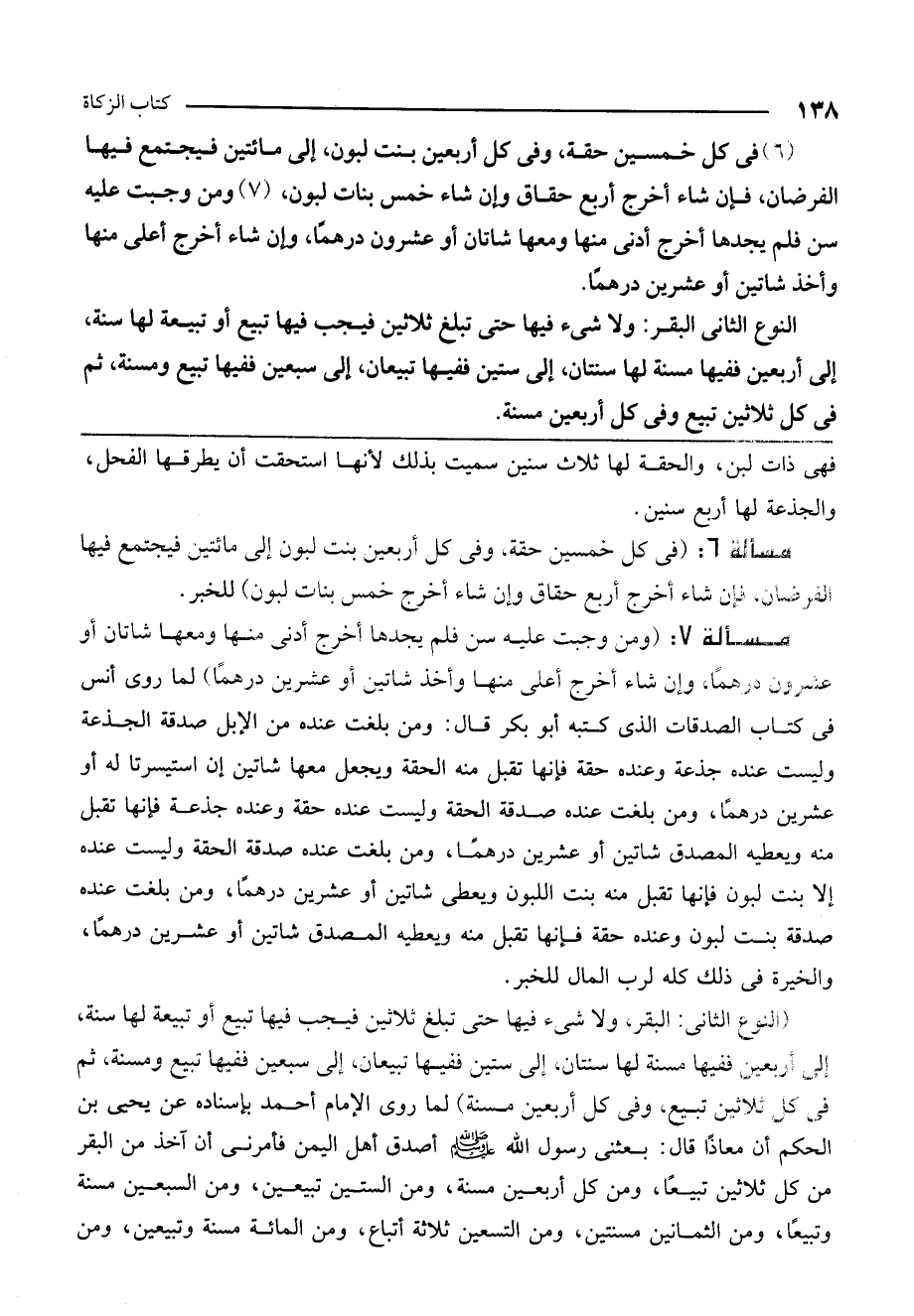 (7) ومن وجبت عليه سن فلم يجدها أخرج أدنى منها ومعها شاتان أو عشرون درهمًا، وإن شاء أخرج أعلى منها وأخذ شاتين أو عشرين درهمًا) (النوع الثاني: البقر، ولا شيء فيها حتى تبلغ ثلاثين فيجب فيها تبيع أو تبيعة لها سنة، إلى أربعين ففيها مسنة لها سنتان، إلى ستين ففيها تبيعان، إلى سبعين ففيها تبيع ومسنة، ثم في كل ثلاثين تبيع وفي كل أربعين مسنة)