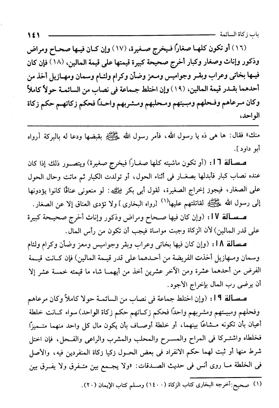 (19) وإن اختلط جماعة في نصاب من السائمة حولًا كاملًا وكان مرعاهم وفحلهم ومبيتهم ومحلبهم ومشربهم واحدًا فحكم زكاتها حكم زكاة الواحد