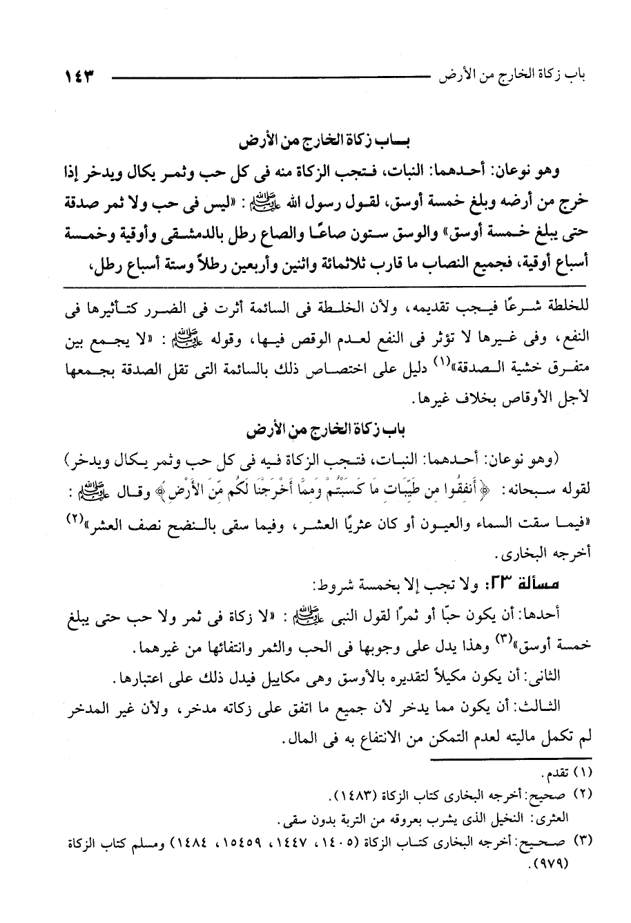 باب زكاة الخارج من الأرض وهو نوعان: أحدهما: النبات، فتجب الزكاة منه في كل حب وثمر يكال ويدخر إذا خرج من أرضه وبلغ خمسة أوسق، لقول رسول الله - صَلَّى اللَّهُ عَلَيْهِ وَسَلَّمَ -: «ليس في حب ولا ثمر صدقة حتى يبلغ خمسة أوسق» . والوسق ستون صاعًا والصاع رطل بالدمشقي وأوقية وخمسة أسباع أوقية، فجميع النصاب ما قارب ثلاثمائة واثنين وأربعين رطلاً وستة أسباع رطل