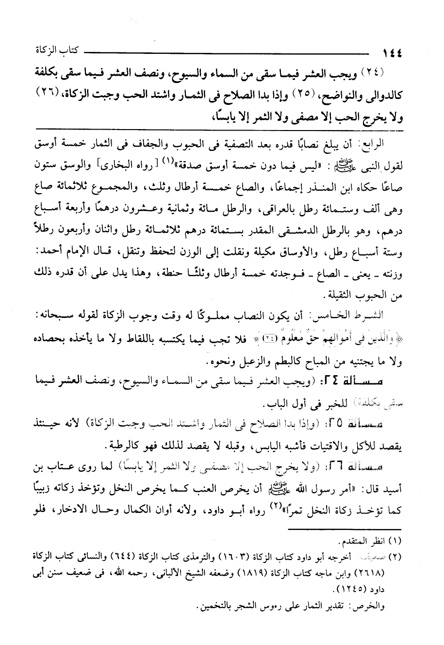 مسألة 26: (ولا يخرج الحب إلا مصفى ولا الثمر إلا يابسًا) لما روى عتاب بن أسيد قال: «أمر رسول الله - صَلَّى اللَّهُ عَلَيْهِ وَسَلَّمَ - أن يخرص العنب كما يخرص النخل وتؤخذ زكاته زبيبًا كما تؤخذ زكاة النخل تمرًا» رواه أبو داود، ولأنه أوان الكمال وحال الادخار، فلو