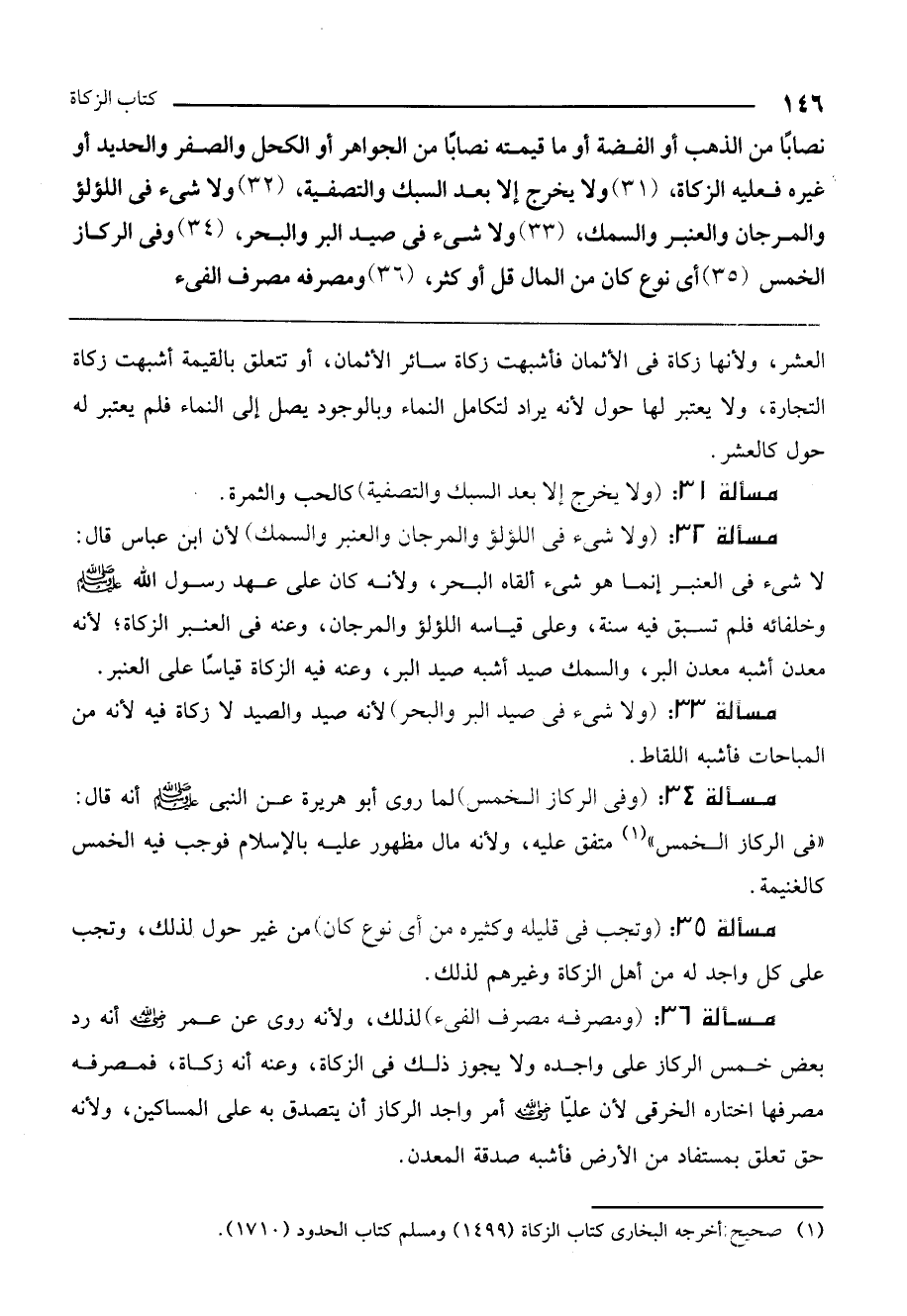 مسألة 32: (ولا شيء في اللؤلؤ والمرجان والعنبر والسمك) ، لأن ابن عباس قال: لا شيء في العنبر إنما هو شيء ألقاه البحر، ولأنه كان على عهد رسول الله - صَلَّى اللَّهُ عَلَيْهِ وَسَلَّمَ - وخلفائه فلم تسبق فيه سنة، وعلى قياسه اللؤلؤ والمرجان، وعنه في العنبر الزكاة، لأنه معدن أشبه معدن البر، والسمك صيد أشبه صيد البر، وعنه فيه الزكاة قياسًا على العنبر.