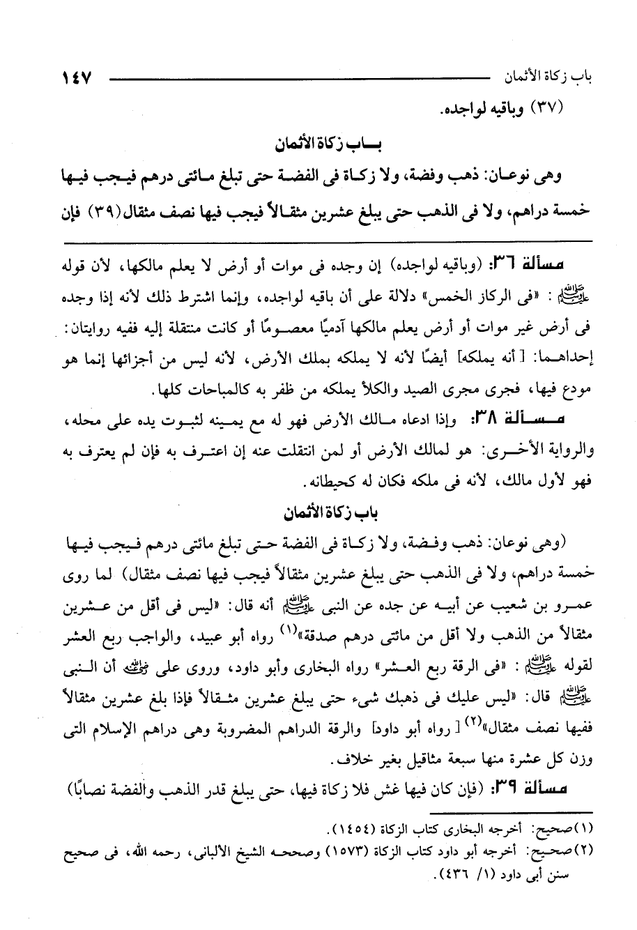 باب زكاة الأثمان وهي نوعان: ذهب وفضة، ولا زكاة في الفضة حتى تبلغ مائتي درهم فيجب فيها خمسة دراهم، ولا في الذهب حتى يبلغ عشرين مثقالًا فيجب فيها نصف مثقال