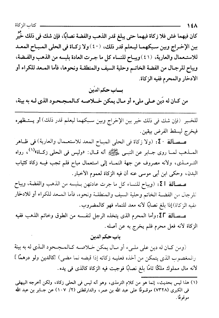 مسألة 40: (ولا زكاة في الحلي المباح المعد للاستعمال والعارية) في ظاهر المذهب لما روى جابر عن النبي - صَلَّى اللَّهُ عَلَيْهِ وَسَلَّمَ - أنه قال: «ليس في الحلي زكاة» رواه الترمذي، ولأنه مصروف عن جهة النماء إلى استعمال مباح تجب فيه زكاة كثياب البدن، وحكى ابن أبي موسى عنه أن فيه الزكاة لعموم الأخبار.