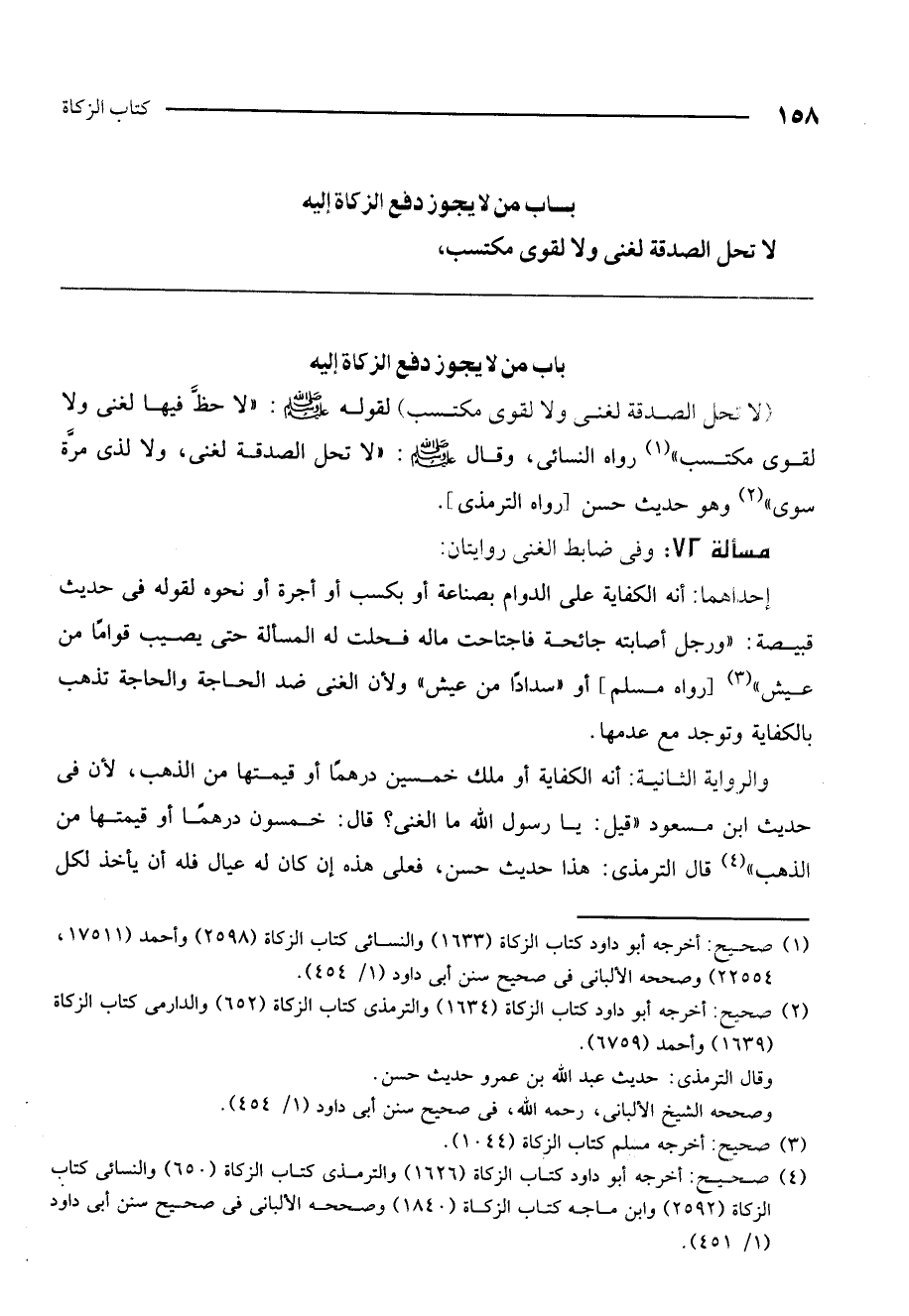 مسألة 72: وفي ضابط الغنى روايتان: إحداهما: أنه الكفاية على الدوام بصناعة أو بكسب، أو أجرة أو نحوه لقوله في حديث قبيصة: «ورجل أصابته جائحة فاجتاحت ماله فحلت له المسألة حتى يصيب قوامًا من عيش " [رواه مسلم] أو " سدادًا من عيش» ولأن الغنى ضد الحاجة والحاجة تذهب بالكفاية وتوجد مع عدمها.
