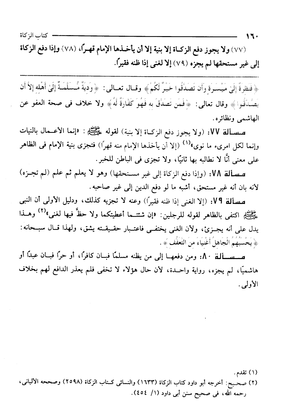 (77) ولا يجوز دفع الزكاة إلا بنية إلا أن يأخذها الإمام قهرًا،