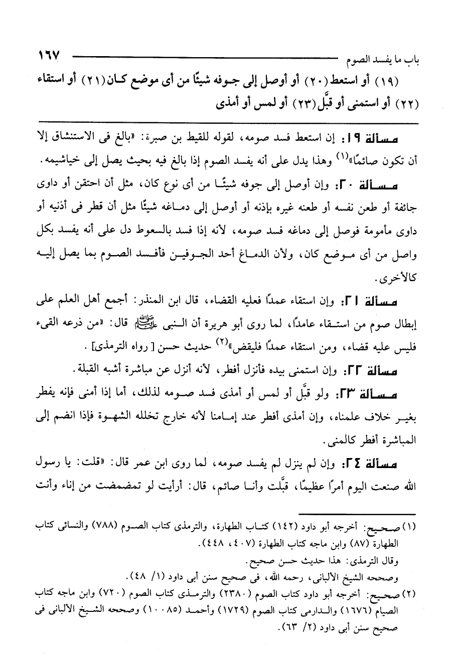 ـــــــــــــــــــــــــــــQمسألة 19: إن استعط فسد صومه، لقوله للقيط بن صبرة: «بالغ في الاستنشاق إلا أن تكون صائمًا» وهذا يدل على أنه يفسد الصوم إذا بالغ فيه بحيث يصل إلى خياشيمه.
