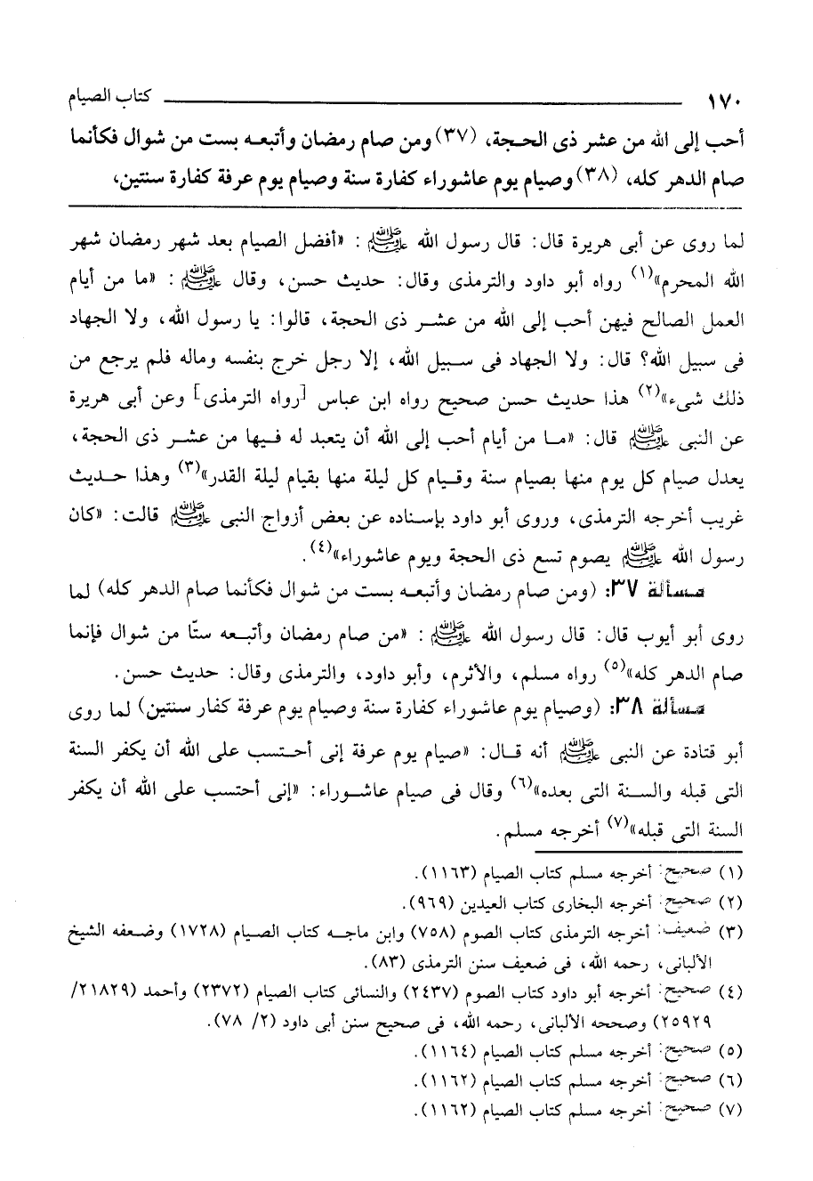 مسألة 38: (وصيام يوم عاشوراء كفارة سنة وصيام يوم عرفة كفارة سنتين) لما روى أبو قتادة عن النبي - صَلَّى اللَّهُ عَلَيْهِ وَسَلَّمَ - أنه قال: «صيام يوم عرفة إني أحتسب على الله أن يكفر السنة التي قبله والسنة التي بعده» . وقال في صيام عاشوراء: «إني أحتسب على الله أن يكفر السنة التي قبله» أخرجه مسلم.