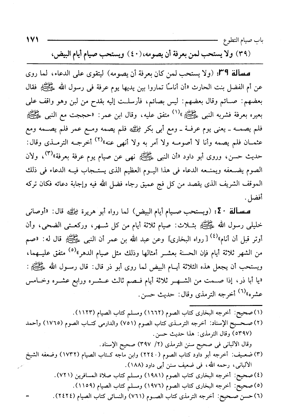 مسألة 40: (ويستحب صيام أيام البيض) لما رواه أبو هريرة - رَضِيَ اللَّهُ عَنْهُ - قال: "أوصاني «خليلي رسول الله - صَلَّى اللَّهُ عَلَيْهِ وَسَلَّمَ - بثلاث: صيام ثلاثة أيام من كل شهر، وركعتي الضحى، وأن أوتر قبل أن أنام» [رواه البخاري] وعن عبد الله بن عمر أن النبي - صَلَّى اللَّهُ عَلَيْهِ وَسَلَّمَ - قال له: «صم من الشهر ثلاثة أيام فإن الحسنة بعشر أمثالها وذلك مثل صيام الدهر» متفق عليهما. ويستحب أن يجعل هذه الثلاثة أيام البيض لما روى أبو ذر قال: قال رسول الله - صَلَّى اللَّهُ عَلَيْهِ وَسَلَّمَ -: «يا أبا ذر، إذا صمت من الشهر ثلاثة أيام فصم ثالث عشره ورابع عشره وخامس عشره» أخرجه الترمذي وقال: حديث حسن.