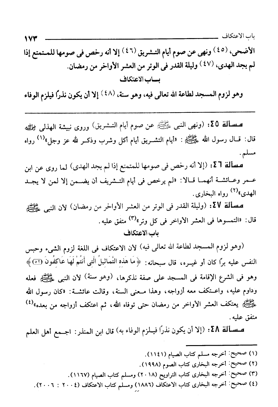 ـــــــــــــــــــــــــــــQمسألة 45: (ونهى النبي - صَلَّى اللَّهُ عَلَيْهِ وَسَلَّمَ - عن صوم أيام التشريق) وروى نبيشة الهذلي - رَضِيَ اللَّهُ عَنْهُ - قال: قال رسول الله - صَلَّى اللَّهُ عَلَيْهِ وَسَلَّمَ -: «أيام التشريق أيام أكل وشرب وذكر لله عز وجل» رواه مسلم.