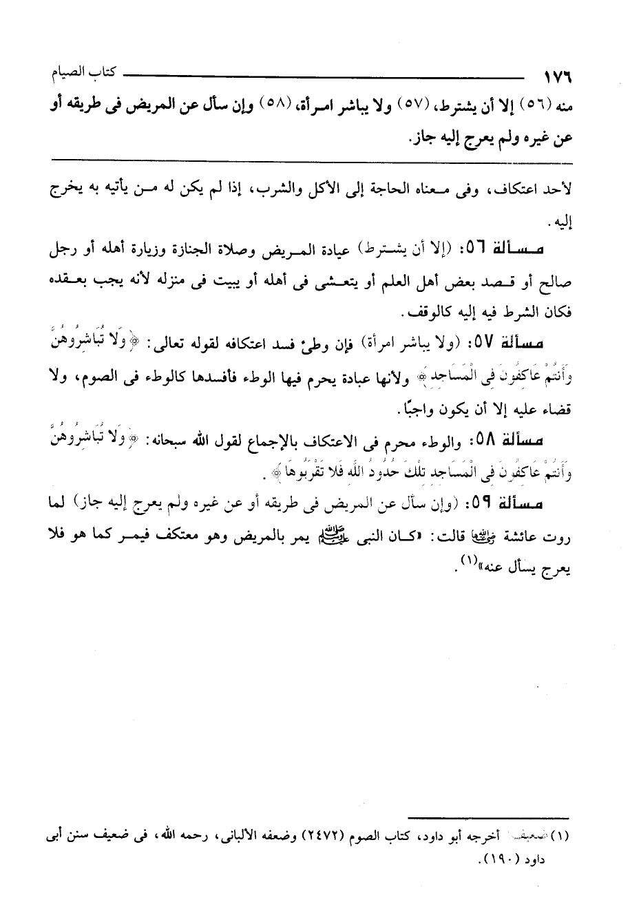 مسألة 59: (وإن سأل عن المريض في طريقه أو عن غيره ولم يعرج إليه جاز) لما روت عائشة - رَضِيَ اللَّهُ عَنْهَا - قالت: «كان النبي - صَلَّى اللَّهُ عَلَيْهِ وَسَلَّمَ - يمر بالمريض وهو معتكف فيمر كما هو فلا يعرج يسأل عنه» .