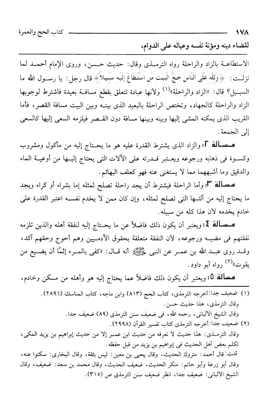 مسألة 4: ويعتبر أن يكون ذلك فاضلًا عن ما يحتاج إليه لنفقة أهله والذين تلزمه نفقتهم في مضيه ورجوعه، لأن النفقة متعلقة بحقوق الآدميين وهم أحوج وحقهم آكد، وقد روى عبد الله بن عمر عن النبي - صَلَّى اللَّهُ عَلَيْهِ وَسَلَّمَ - أنه قال: «كفى بالمرء إثمًا أن يضيع من يقوت» رواه أبو داود.