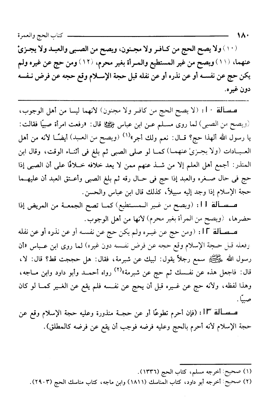 ـــــــــــــــــــــــــــــQمسألة 10: (لا يصح الحج من كافر ولا مجنون) لأنهما ليسا من أهل الوجوب، (ويصح من الصبي) لما روى مسلم عن ابن عباس قال: «رفعت امرأة صبيًا فقالت: يا رسول الله ألهذا حج؟ قال: نعم ولك أجر» (ويصح من العبد) أيضًا لأنه من أهل العبادات (ولا يجزئ عنهما) كما لو صلى الصبي ثم بلغ في أثناء الوقت، وقال ابن المنذر: أجمع أهل العلم إلا من شذ عنهم ممن لا يعد خلافه خلافًا، على أن الصبي إذا حج في حال صغره والعبد إذا حج في حال رقه ثم بلغ الصبي وأعتق العبد أن عليهما حجة الإسلام إذا وجدا إليه سبيلًا، كذلك قال ابن عباس والحسن.
