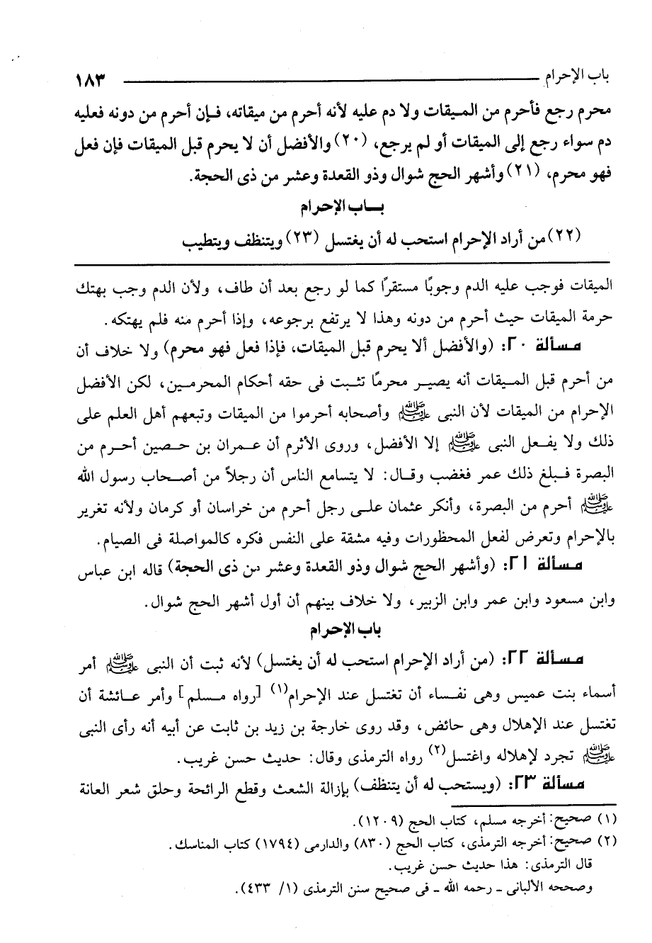 مسألة 22: (من أراد الإحرام استحب له أن يغتسل) لأنه ثبت «أن النبي - صَلَّى اللَّهُ عَلَيْهِ وَسَلَّمَ - أمر أسماء بنت عميس وهي نفساء أن تغتسل عند الإحرام» [رواه مسلم] ، «وأمر عائشة أن تغتسل عند الإهلال وهي حائض» . وقد «روى خارجة بن زيد بن ثابت عن أبيه أنه رأى النبي - صَلَّى اللَّهُ عَلَيْهِ وَسَلَّمَ - تجرد لإهلاله واغتسل» رواه الترمذي وقال: حديث حسن غريب.