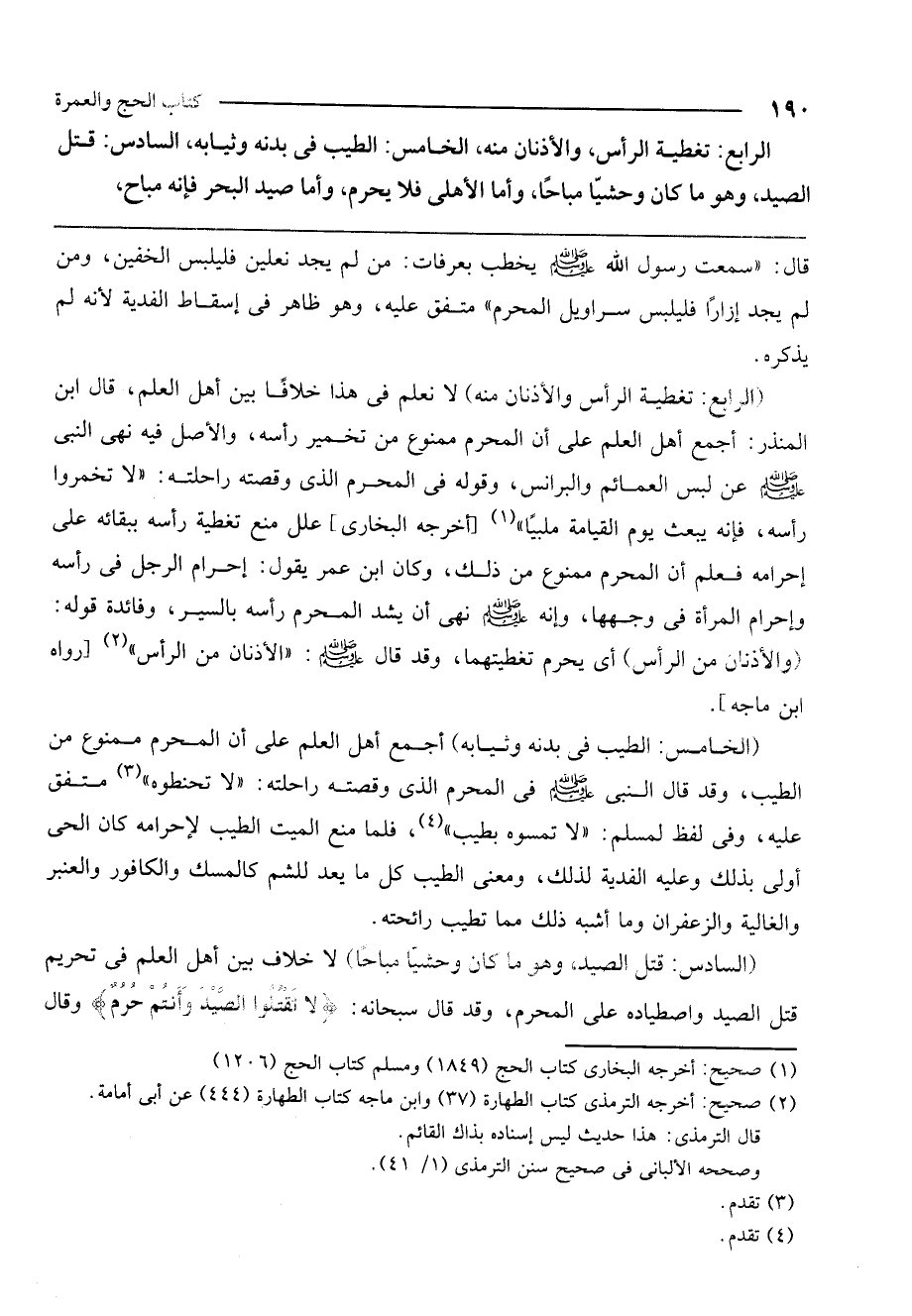 الرابع: تغطية الرأس، والأذنان منه. الخامس: الطيب في بدنه وثيابه. السادس: قتل الصيد، وهو ما كان وحشيًا مباحًا، وأما الأهلي فلا يحرم، وأما صيد البحر فإنه مباح