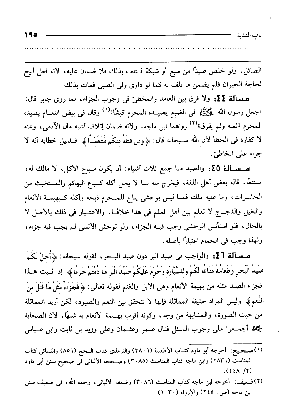 مسألة 44: ولا فرق بين العامد والمخطئ في وجوب الجزاء، لما روى جابر قال: «جعل رسول الله - صَلَّى اللَّهُ عَلَيْهِ وَسَلَّمَ - في الضبع يصيده المحرم كبشًا" وقال في بيض النعام يصيده المحرم: "ثمنه ولم يفرق» رواهما ابن ماجه ولأنه ضمان إتلاف أشبه مال الآدمي، وعنه لا كفارة في الخطأ لأن الله سبحانه قال: {وَمَنْ قَتَلَهُ مِنْكُمْ مُتَعَمِّدًا} [المائدة: 95] فدليل خطابه أنه لا جزاء على الخاطئ.