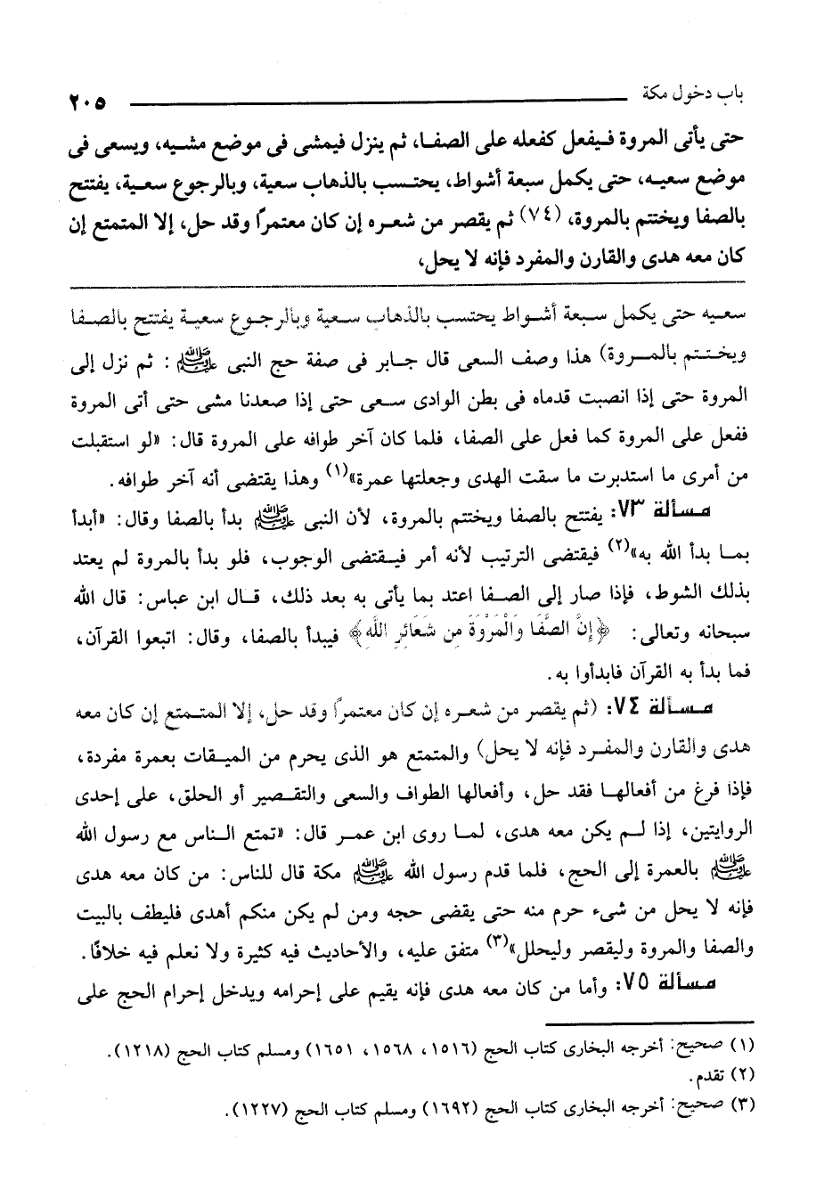 مسألة 73: يفتتح بالصفا ويختتم بالمروة، لأن «النبي - صَلَّى اللَّهُ عَلَيْهِ وَسَلَّمَ - بدأ بالصفا وقال: "أبدأ بما بدأ الله به» فيقتضي الترتيب لأنه أمر فيقتضي الوجوب، فلو بدأ بالمروة لم يعتد بذلك الشوط، فإذا صار إلى الصفا اعتد بما يأتي به بعد ذلك، قال ابن عباس: قال الله سبحانه وتعالى: {إِنَّ الصَّفَا وَالْمَرْوَةَ مِنْ شَعَائِرِ اللَّهِ} [البقرة: 158] ، فيبدأ بالصفا، وقال: اتبعوا القرآن، فما بدأ به القرآن فابدءوا به.
