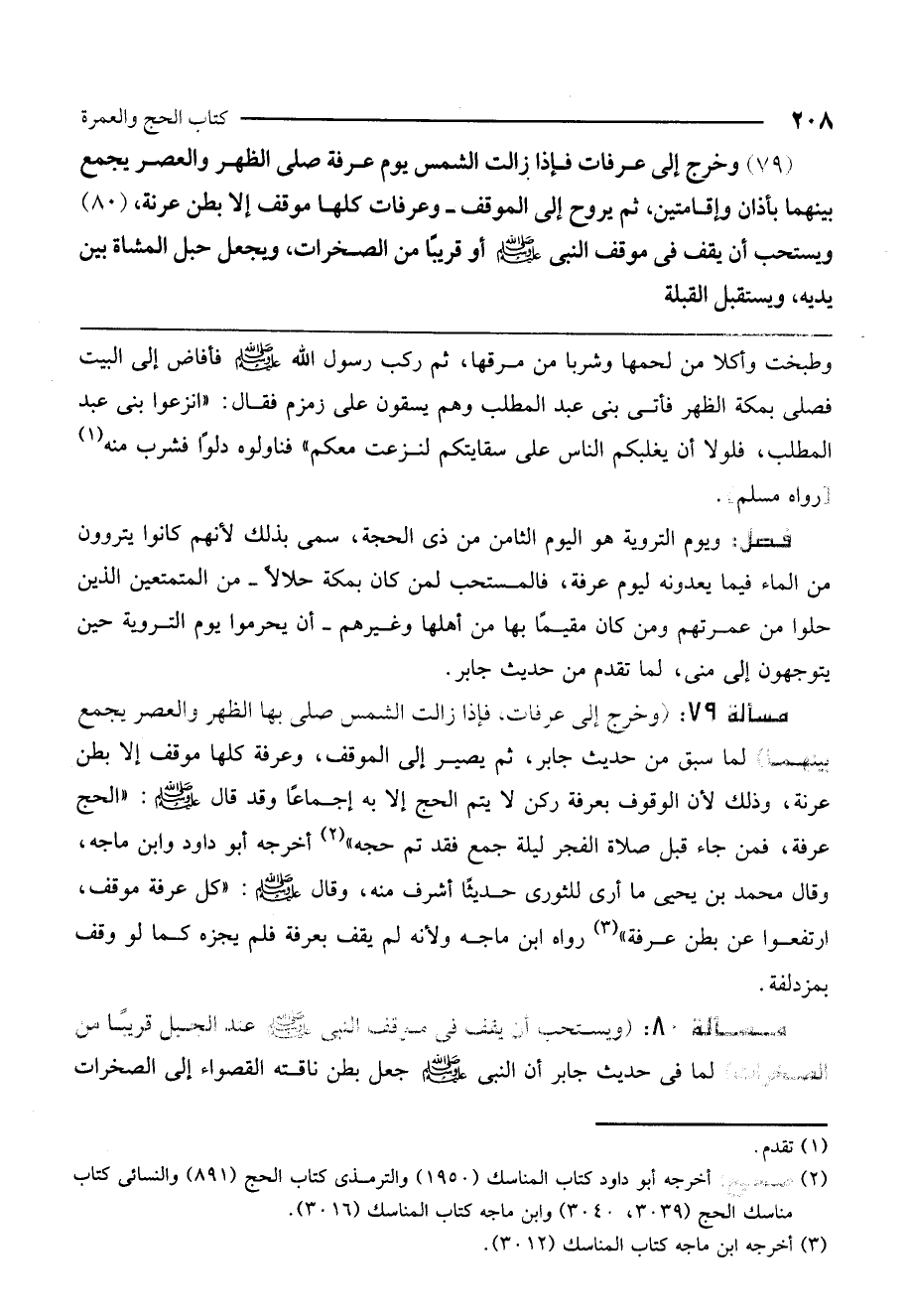 مسألة 79: (وخرج إلى عرفات، فإذا زالت الشمس صلى بها الظهر والعصر يجمع بينهما) لما سبق من حديث جابر، ثم يصير إلى الموقف، وعرفة كلها موقف إلا بطن عرنة وذلك لأن الوقوف بعرفة ركن لا يتم الحج إلا به إجماعًا، وقد قال - صَلَّى اللَّهُ عَلَيْهِ وَسَلَّمَ -: «الحج عرفة، فمن جاء قبل صلاة الفجر ليلة جمع فقد تم حجه» أخرجه أبو داود وابن ماجه، وقال محمد بن يحيى: ما أرى للثوري حديثًا أشرف منه، وقال - صَلَّى اللَّهُ عَلَيْهِ وَسَلَّمَ -: «كل عرفة موقف، ارتفعوا عن بطن عرنة» رواه ابن ماجه، ولأنه لم يقف بعرفة فلم يجزه كما لو وقف بمزدلفة.