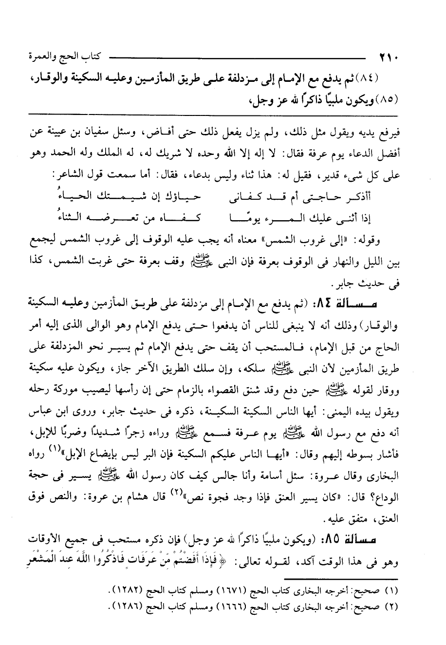 مسألة 84: (ثم يدفع مع الإمام إلى مزدلفة على طريق المأزمين وعليه السكينة والوقار) وذلك أنه لا ينبغي للناس أن يدفعوا حتى يدفع الإمام وهو الوالي الذي إليه أمر الحاج من قبل الإمام، فالمستحب أن يقف حتى يدفع الإمام ثم يسير نحو المزدلفة على طريق المأزمين لأن النبي - صَلَّى اللَّهُ عَلَيْهِ وَسَلَّمَ - سلكه، وإن سلك الطريق الآخر جاز، ويكون عليه سكينة ووقار «لقوله - صَلَّى اللَّهُ عَلَيْهِ وَسَلَّمَ - حين دفع وقد شنق القصواء بالزمام حتى إن رأسها ليصيب موركة رحله ويقول بيده اليمنى: أيها الناس السكينة السكينة» ذكره في حديث جابر. «وروى ابن عباس أنه دفع مع رسول الله - صَلَّى اللَّهُ عَلَيْهِ وَسَلَّمَ - يوم عرفة فسمع - صَلَّى اللَّهُ عَلَيْهِ وَسَلَّمَ - وراءه زجرًا شديدًا وضربًا للإبل، فأشار بسوطه إليهم وقال: "أيها الناس عليكم السكينة فإن البر ليس بإيضاع الإبل» رواه البخاري، «وقال عروة: سئل أسامة وأنا جالس كيف كان رسول الله - صَلَّى اللَّهُ عَلَيْهِ وَسَلَّمَ - يسير في حجة الوداع؟ قال: "كان يسير العنق فإذا وجد فجوة نص» . قال هشام بن عروة: والنص فوق العنق. متفق عليه.