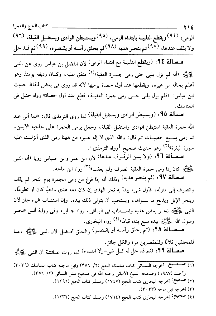 مسألة 96: (ولا يسن الوقوف عندها) لأن ابن عمر وابن عباس رويا «أن النبي - صَلَّى اللَّهُ عَلَيْهِ وَسَلَّمَ - إذا رمى جمرة العقبة انصرف ولم يعقب» رواه ابن ماجه.