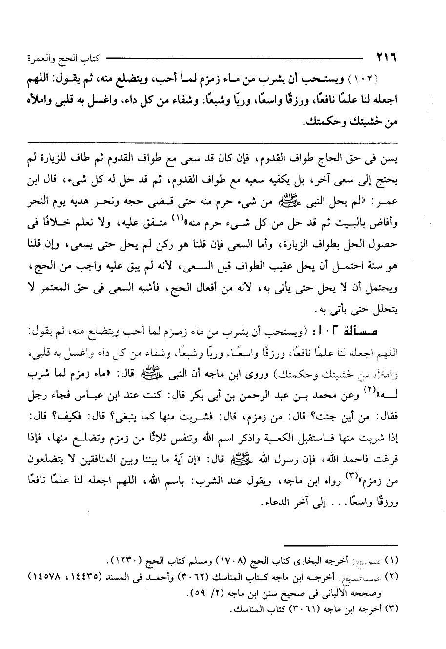 مسألة 102: (ويستحب أن يشرب من ماء زمزم لما أحب ويتضلع منه، ثم يقول: اللهم اجعله لنا علمًا نافعًا، ورزقًا واسعًا، وريًا وشبعًا، وشفاء من كل داء واغسل به قلبي، واملأه من خشيتك وحكمتك) وروى ابن ماجه أن النبي - صَلَّى اللَّهُ عَلَيْهِ وَسَلَّمَ - قال: «ماء زمزم لما شرب له» «وعن محمد بن عبد الرحمن بن أبي بكر قال: كنت عند ابن عباس فجاء رجل فقال: من أين جئت؟ قال: من زمزم، قال: فشربت منها كما ينبغي؟ قال: فكيف؟ قال: إذا شربت منها فاستقبل الكعبة واذكر اسم الله وتنفس ثلاثًا من زمزم وتضلع منها، إذا فرغت فاحمد الله، فإن رسول الله - صَلَّى اللَّهُ عَلَيْهِ وَسَلَّمَ - قال: "إن آية ما بيننا وبين المنافقين لا يتضلعون من زمزم» رواه ابن ماجه. ويقول عند الشرب: بسم الله، اللهم اجعله لنا علمًا نافعًا ورزقًا واسعًا. . . إلى آخر الدعاء.