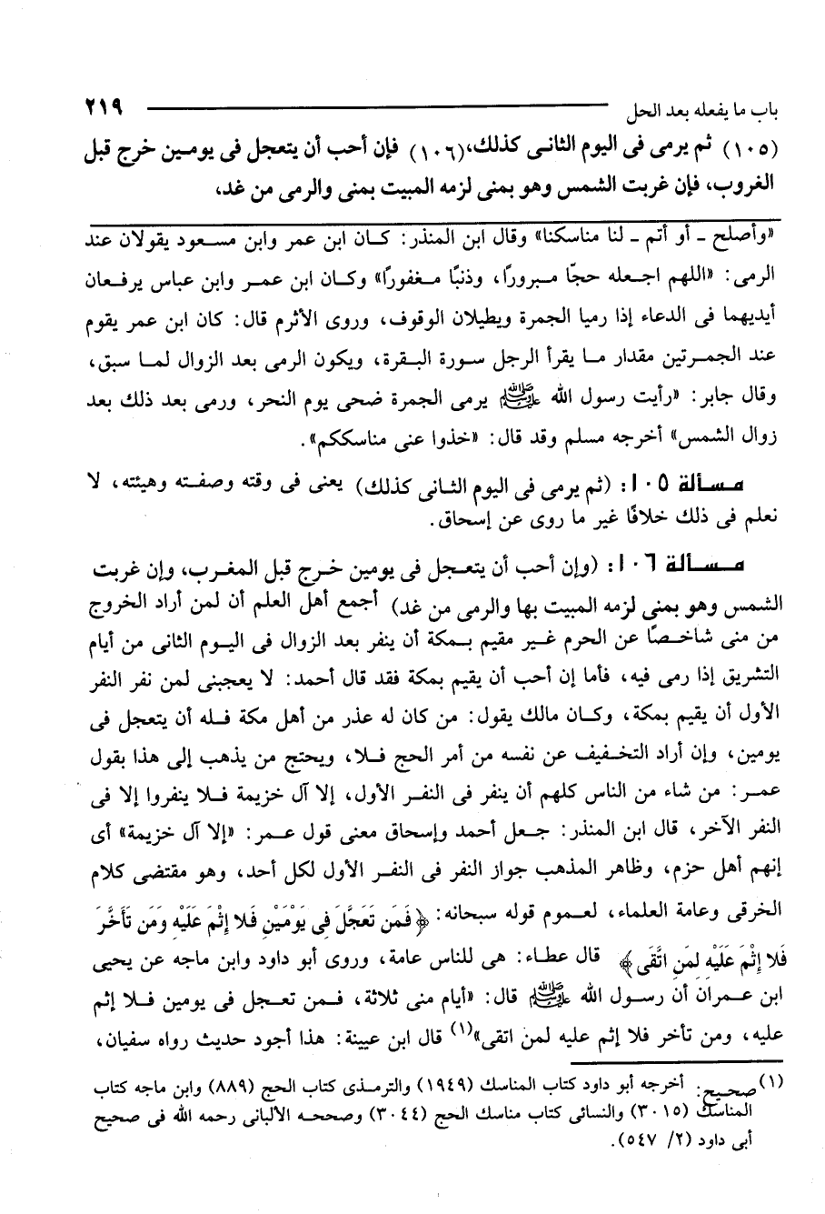 مسألة 106: (وإن أحب أن يتعجل في يومين خرج قبل المغرب، وإن غربت الشمس وهو بمنى لزمه المبيت بها والرمي من غد) أجمع أهل العلم أن لمن أراد الخروج من منى شاخصًا عن الحرم غير مقيم بمكة أو ينفر بعد الزوال في اليوم الثاني من أيام التشريق إذا رمى فيه، فأما إن أحب أن يقيم بمكة فقد قال أحمد: لا يعجبني لمن نفر النفر الأول أن يقيم بمكة. وكان مالك يقول: من كان له عذر من أهل مكة فله أن يتعجل في يومين، وإن أراد التخفيف عن نفسه من أمر الحج فلا، ويحتج من يذهب إلى هذا بقول عمر: من شاء من الناس كلهم أن ينفر في النفر الأول، إلا آل خزيمة فلا ينفروا إلا في النفر الآخر. قال ابن المنذر: جعل أحمد وإسحاق معنى قول عمر: "إلا آل خزيمة " أي أنهم أهل حزم. وظاهر المذهب جواز النفر في النفر الأول لكل أحد، وهو مقتضى كلام الخرقي وعامة العلماء، لعموم قوله سبحانه: {فَمَنْ تَعَجَّلَ فِي يَوْمَيْنِ فَلا إِثْمَ عَلَيْهِ وَمَنْ تَأَخَّرَ فَلا إِثْمَ عَلَيْهِ لِمَنِ اتَّقَى} [البقرة: 203] . قال عطاء: هي للناس عامة. وروى أبو داود، وابن ماجه، عن يحيى بن عمران أن رسول الله - صَلَّى اللَّهُ عَلَيْهِ وَسَلَّمَ - قال: «أيام منى ثلاثة، فمن تعجل في يومين فلا إثم عليه، ومن تأخر فلا إثم عليه لمن اتقى» . قال ابن عيينة: هذا أجود حديث رواه سفيان،