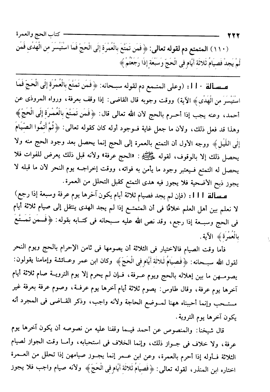 ـــــــــــــــــــــــــــــQمسألة 110: (وعلى المتمتع دم لقوله سبحانه: {فَمَنْ تَمَتَّعَ بِالْعُمْرَةِ إِلَى الْحَجِّ فَمَا اسْتَيْسَرَ مِنَ الْهَدْيِ} [البقرة: 196] الآية) ووقت وجوبه، قال القاضي: إذا وقف بعرفة، ورواه المروذي عن أحمد، وعنه يجب إذا أحرم بالحج لأن الله تعالى قال: {فَمَنْ تَمَتَّعَ بِالْعُمْرَةِ إِلَى الْحَجِّ} [البقرة: 196] وهذا قد فعل ذلك، ولأن ما جعل غاية فوجود أوله كان كقوله تعالى: {ثُمَّ أَتِمُّوا الصِّيَامَ إِلَى اللَّيْلِ} [البقرة: 187] ، ووجه الأول أن التمتع بالعمرة إلى الحج إنما يحصل بعد وجود الحج منه ولا يحصل ذلك إلا بالوقوف، لقوله - صَلَّى اللَّهُ عَلَيْهِ وَسَلَّمَ -: «الحج عرفة» ولأنه قبل ذلك يعرض للفوات فلا يحصل له التمتع فيعتبر وجود ما يأمن به فواته، ووقت إخراجه يوم النحر لأن ما قبله لا يجوز ذبح الأضحية فلا يجوز فيه هدي التمتع كقبل التحلل من العمرة. مسألة 111: (فإن لم يجد فصيام ثلاثة أيام يكون آخرها يوم عرفة وسبعة إذا رجع) لا نعلم بين أهل العلم خلافًا في أن المتمتع إذا لم يجد الهدي ينتقل إلى صيام ثلاثة أيام في الحج وسبعة إذا رجع، وقد نص الله سبحانه عليه في كتابه بقوله: {فَمَنْ تَمَتَّعَ بِالْعُمْرَةِ} [البقرة: 196] الآية.