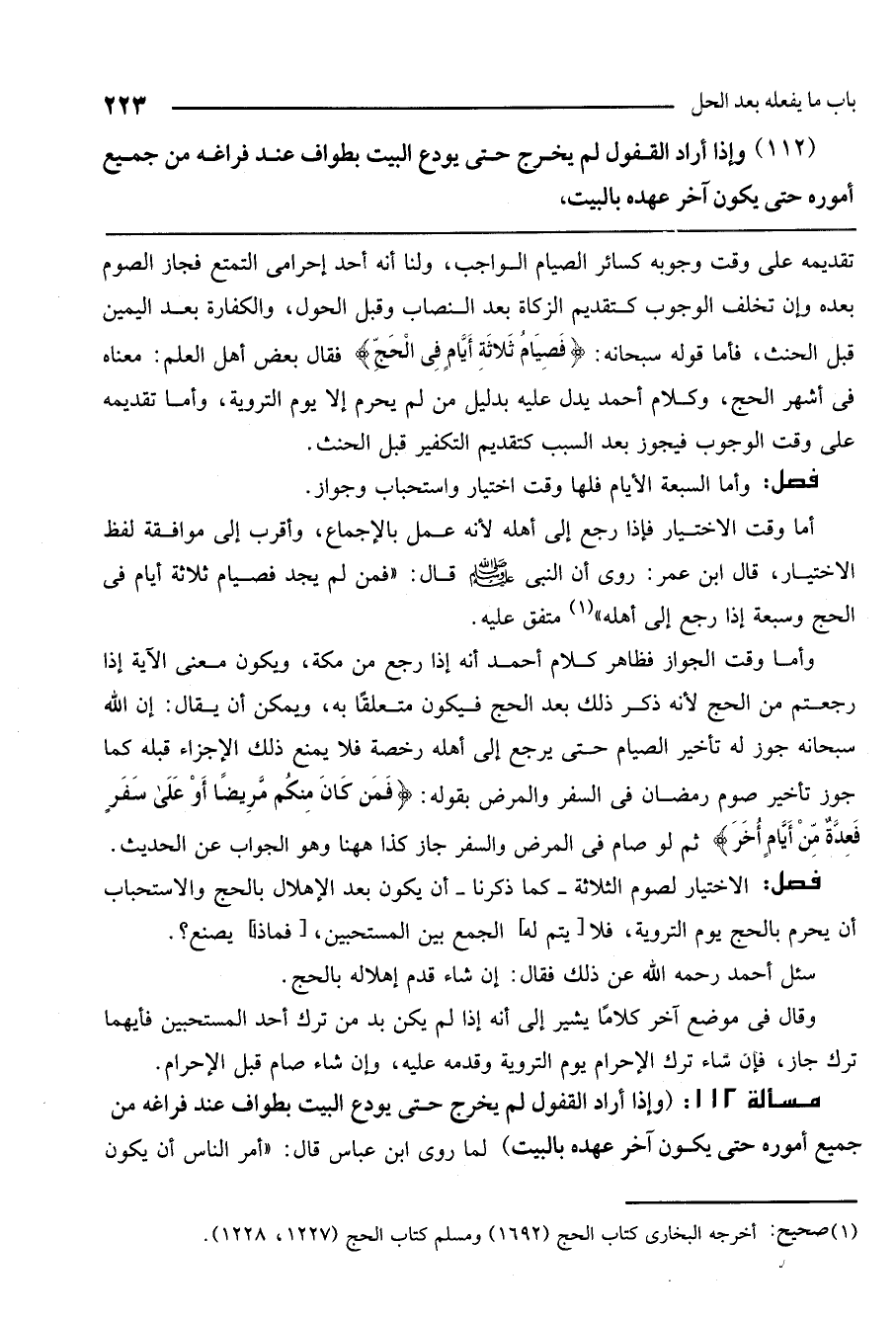 مسألة 112: (وإذا أراد القفول لم يخرج حتى يودع البيت بطواف عند فراغه من جميع أموره حتى يكون آخر عهده بالبيت) لما روى ابن عباس قال: «أمر الناس أن يكون
